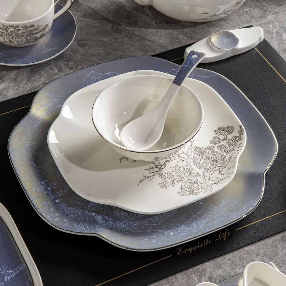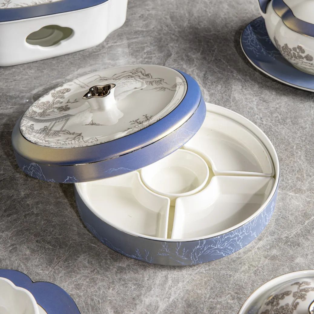 该系列运用蓝与白的经典搭配,似长夜里山间皎洁月色下的呓语。笔触勾勒出绵延群山,草木生长,在这与大自然最亲密的空间里尽情绽放。结庐而居,摈弃世间喧嚣,只与纯粹的世界坐而论道,涤荡心灵,放空自我。生活与自然相合,在这瓷盘间流转,星移物换不变这山间的浪漫,深入身心,清净而舒缓。