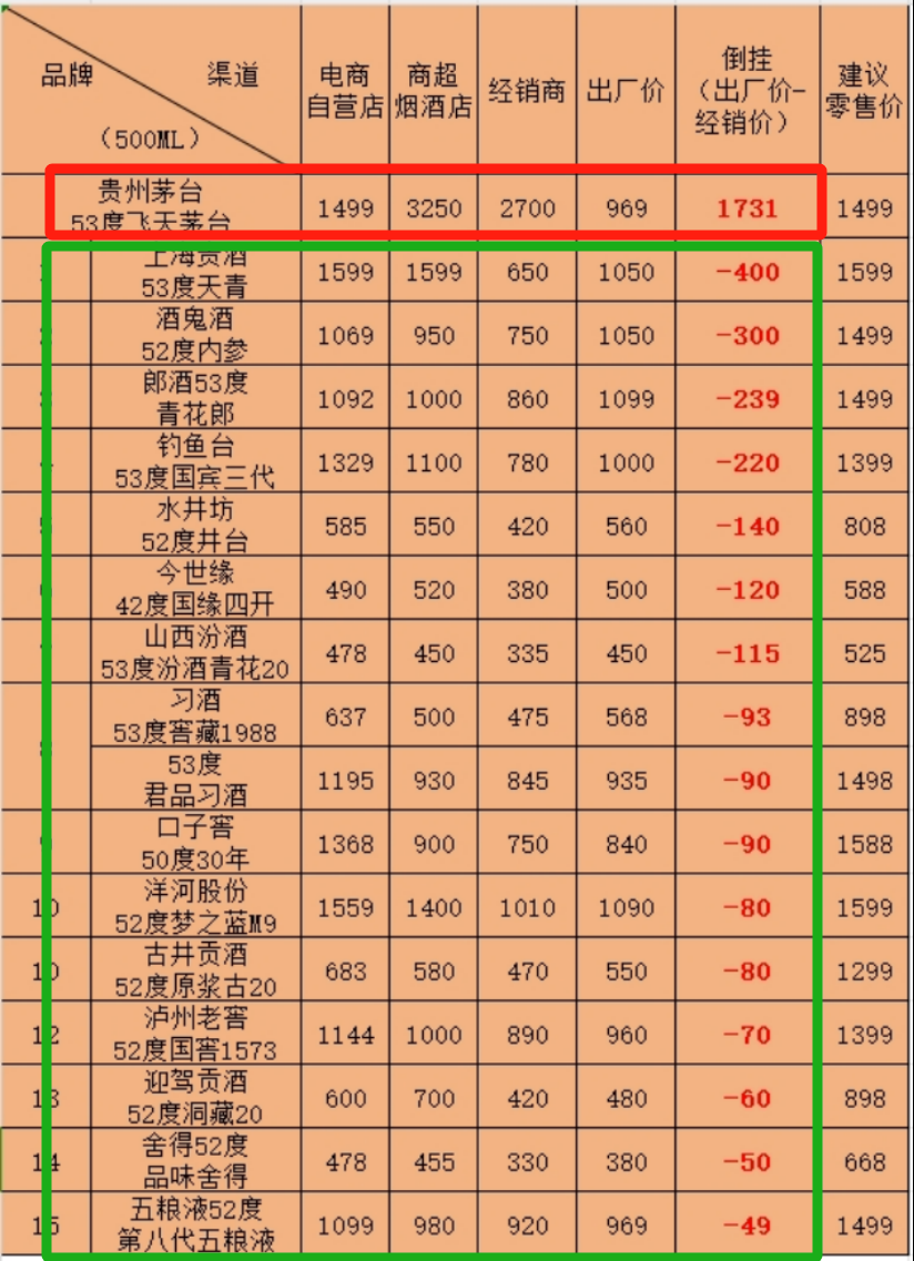 台,其他中高端白酒价格普遍倒挂。