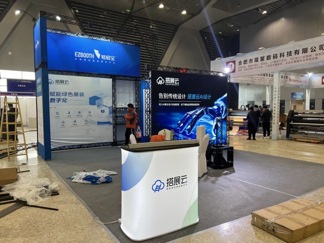 目前展会的各项搭建工作正有序推进,展商与搭建商正紧张有序布展中,户外广告已搭建完成,一起来看!