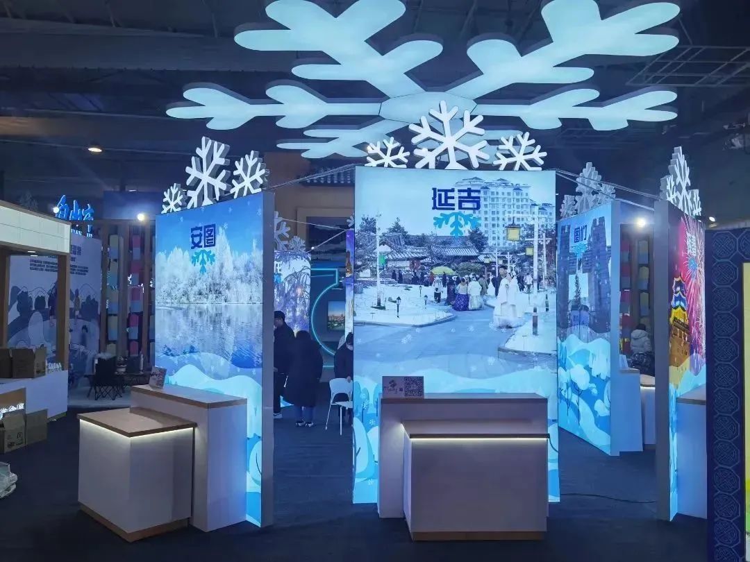 延边展台背景采用雪花组合设计,八县市错落有致围成一圈,背景展示美景,前置各县市展台,展示特色文旅产品,两侧有身着民族服装工作人员为参展人员介绍当地冰雪资源。