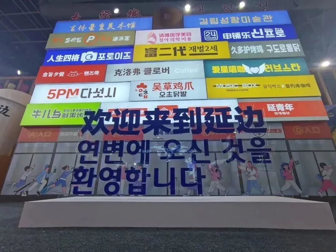 东西两侧的大门采用传统古府大门形象,外观大气典雅,似一扇开启古与今对话的窗口,以红灯笼为装点,体现喜庆与民族融合景象。进门左边是LED媒体大屏,采用高科技搭配朝鲜族传统屏风木结构建筑为背景,镶入灯箱。