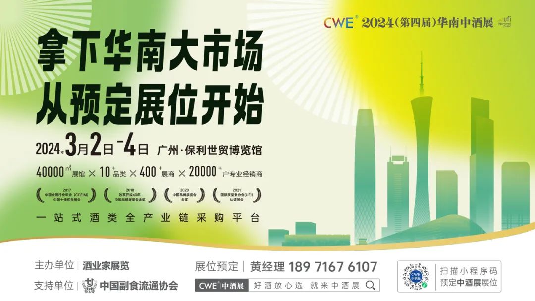 2024(第四届)华南中酒展将于2024年3月2日-4日在广州·保利世贸博览馆举办,展出面积40000+平方米,涵盖白酒、葡萄酒、精酿啤酒、威士忌、黄酒、果酒、包装设计供应商等10+品类,400+参展企业,预计20000+户专业经销商观众将到场参观选品。