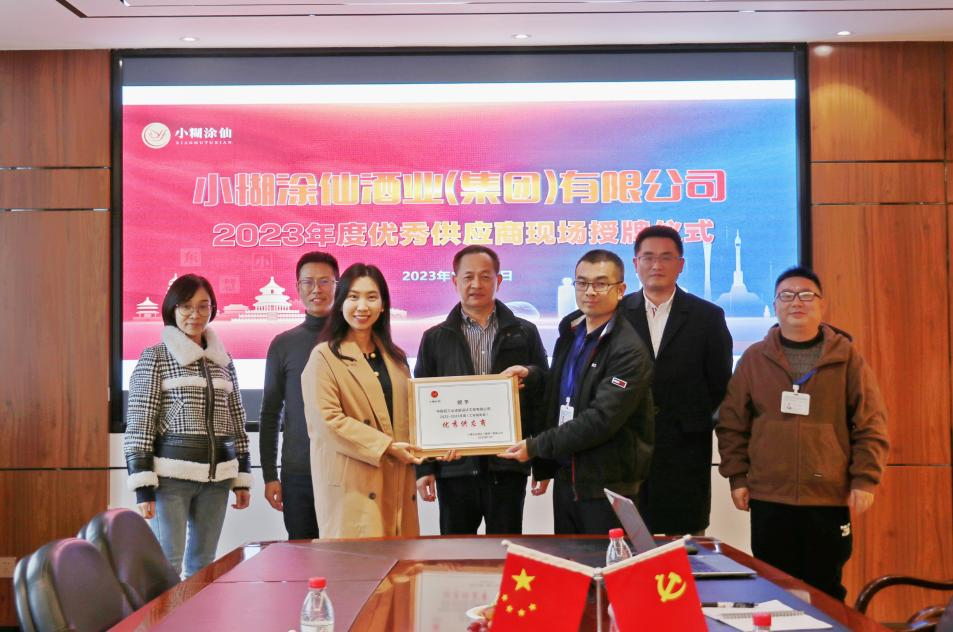 2023年12月12日,小糊涂仙酒业(集团)有限公司领导莅临公司进行 2023年度优秀供应商现场授牌。