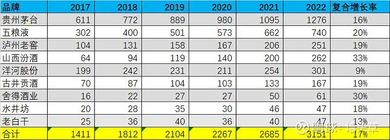 一切靠数据说话,相关数据显示,2016~2022年,全国规上(≥2000万元)酒企数量自1578家减少至963家,减少幅度39%;白酒产量自1358万吨降至671万吨,减少幅度50%。规上酒企数量及产量呈现双减趋势,很显然这个数据是悲观的。但分析问题不能以偏概全,更不能被平均,这里附上9家头部酒业上市公司近几年的营收数据(非全部上市公司、但基本代表行业整体情况,单位:亿元),难以置信的是,2017~2022年,这9家上市酒企营收额自1411亿元上升到3151亿元家,增长幅度高达123%,年复合增长率17%。