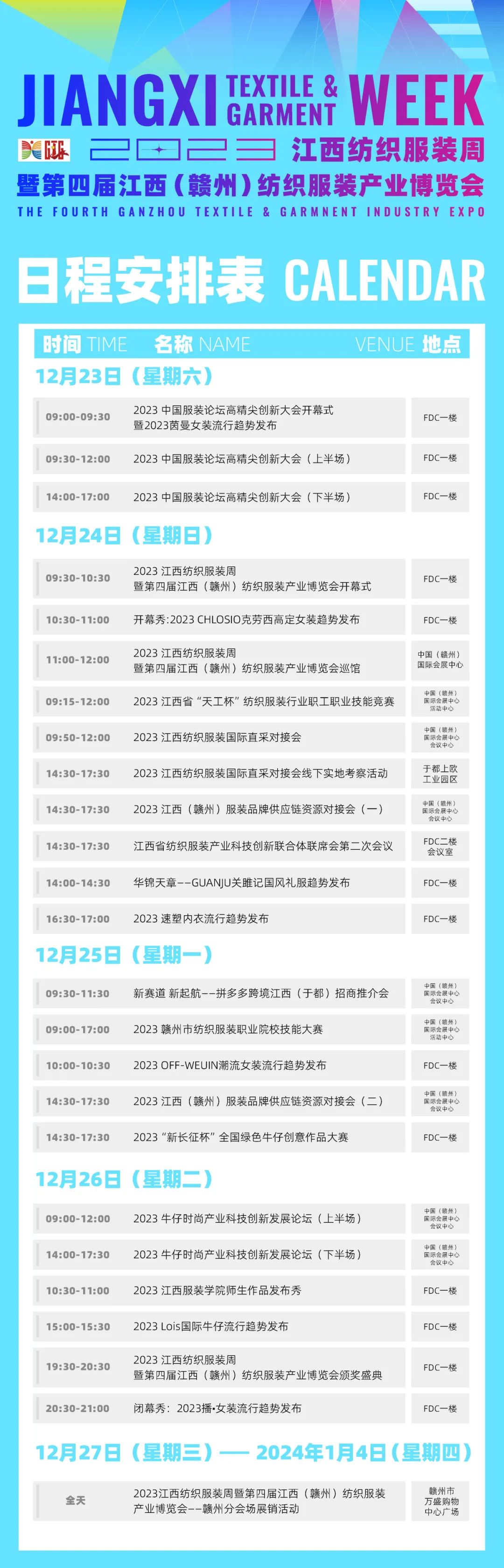 由江西省人民政府、中国纺织工业联合会指导,中国服装协会、江西省工信厅、江西省商务厅、江西省贸促会、赣州市人民政府主办的2023江西纺织服装周暨第四届江西 (赣州)纺织服装产业博览会将于2023年12月23日至26日在中央红军长征集结出发地、中国品牌服装制造名城——江西于都正式启动。