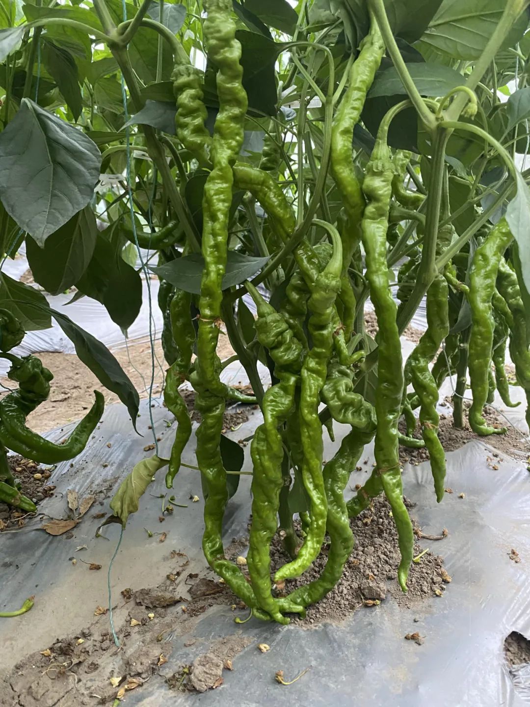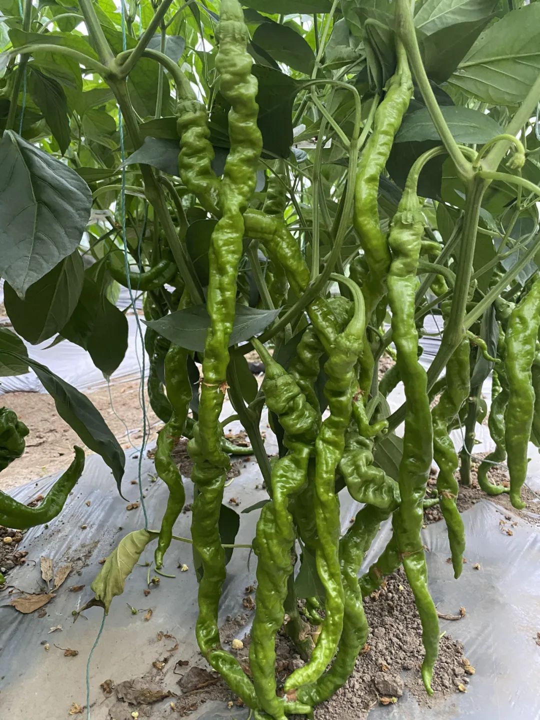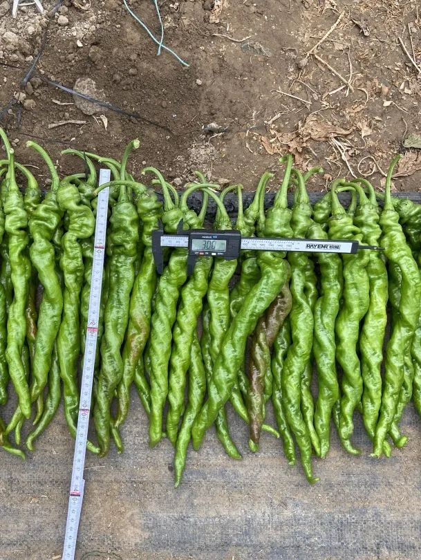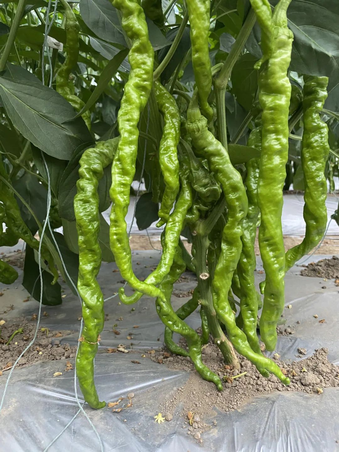 螺丝椒杂交品种,果长26-35cm,果肩横径3.5-4.0cm左右,果皮绿色光泽度好,螺旋度和顺直度好,皮薄肉脆,香辣味浓,口感佳。