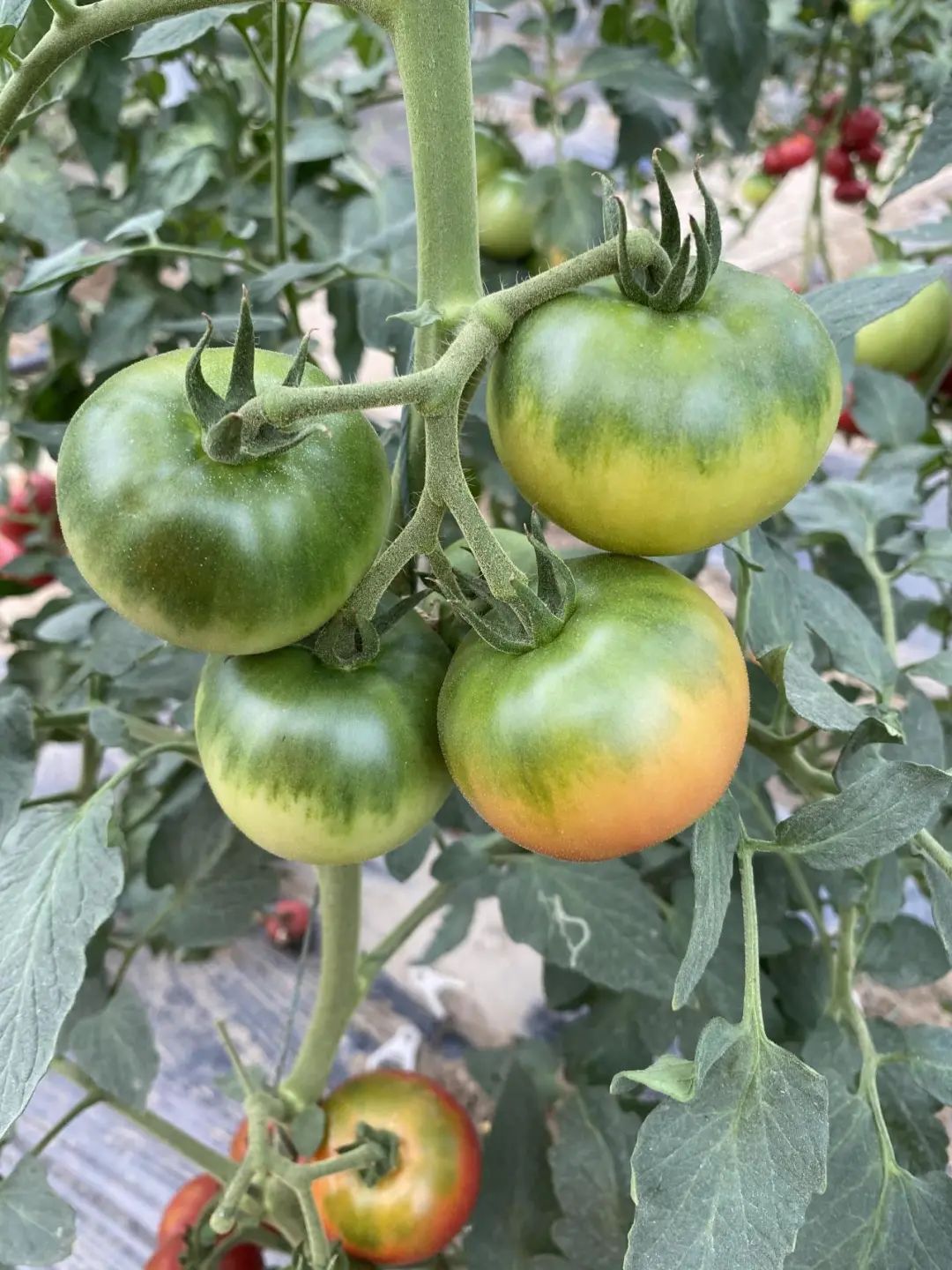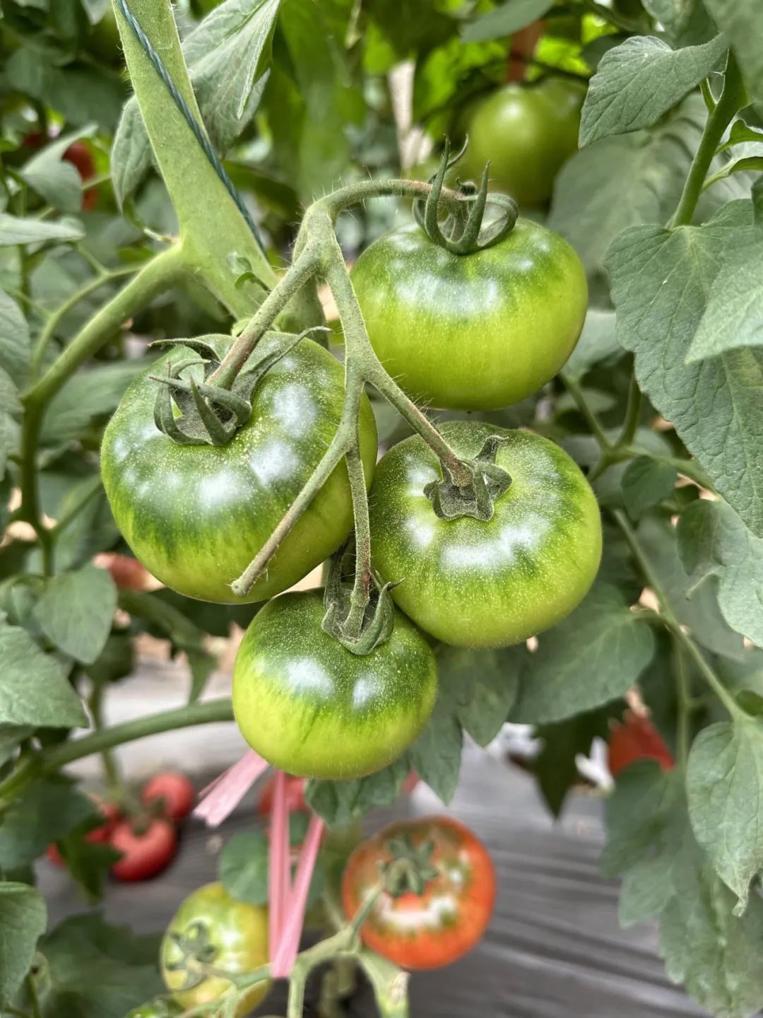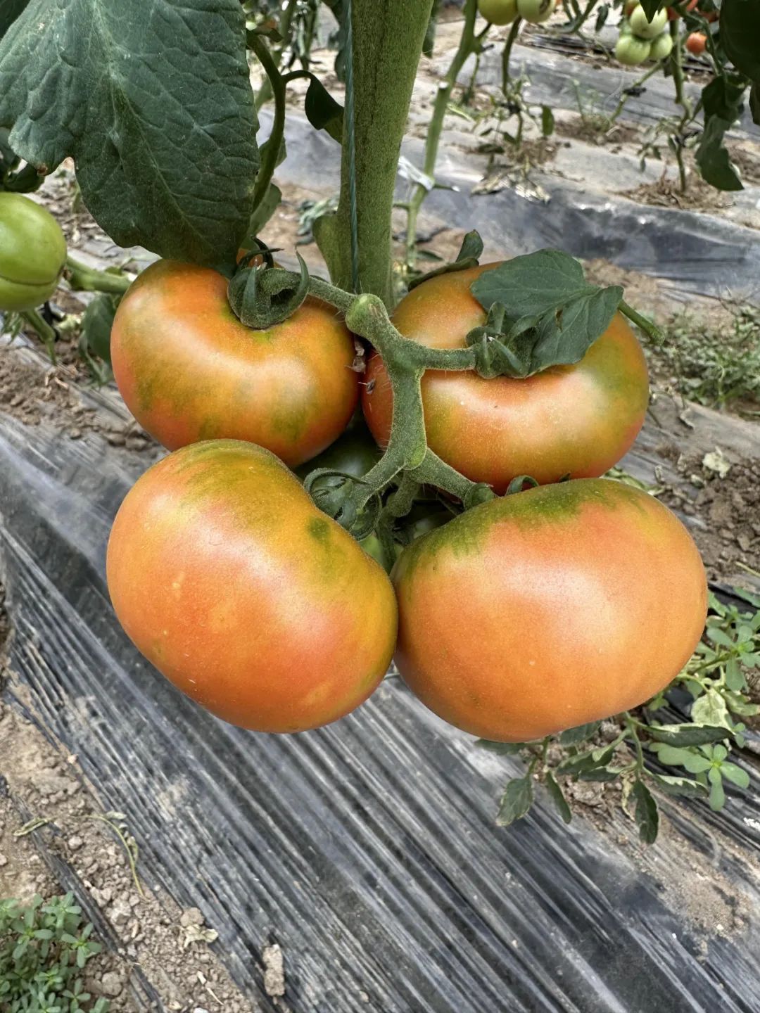 口感型草莓番茄,早熟,果实圆形饱满,青熟果带绿果肩,红熟果淡绿肩保持好,光泽度好,单果重约200g左右,心室多,甜酸多汁,味浓,口感好。