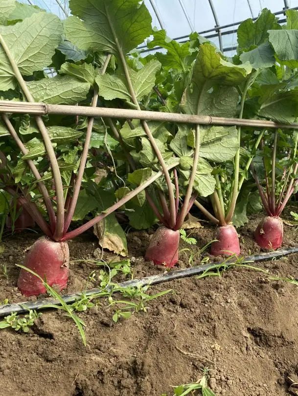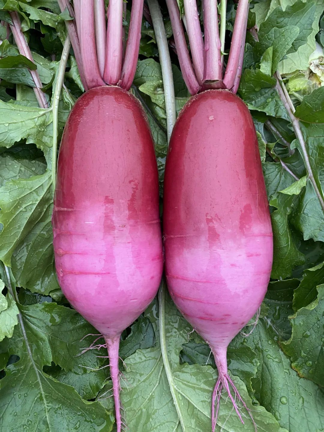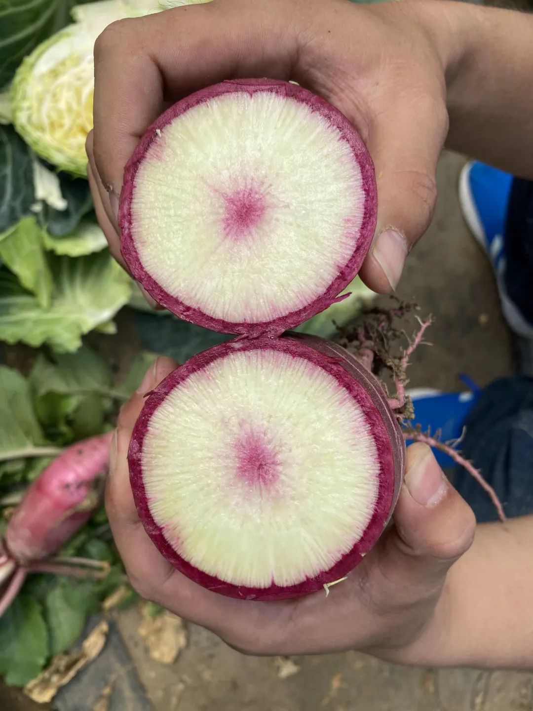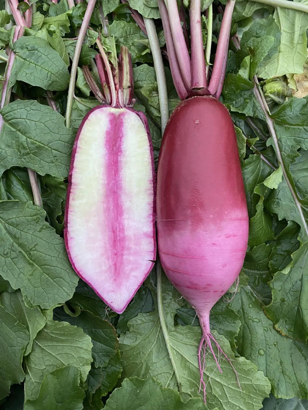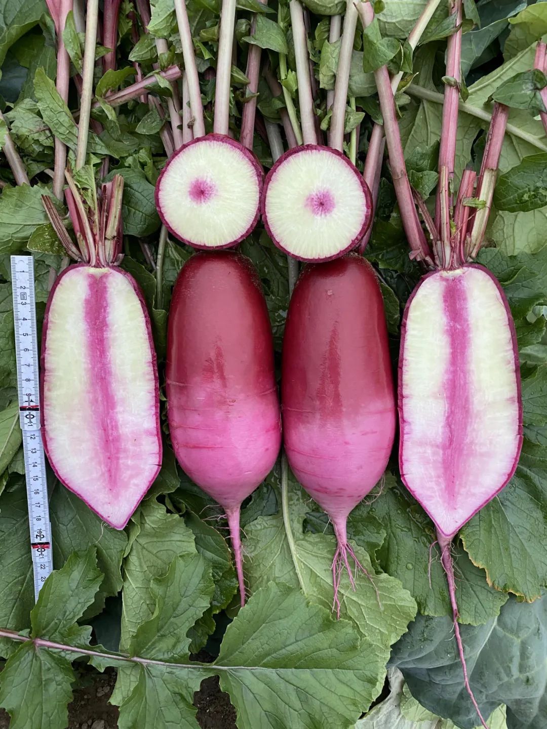 水果型萝卜杂交种,播种后70天左右可收获,根长15cm左右,直径8cm左右,颜色紫红色,肉淡绿,芯紫色,生食甜脆多汁,耐储存。
