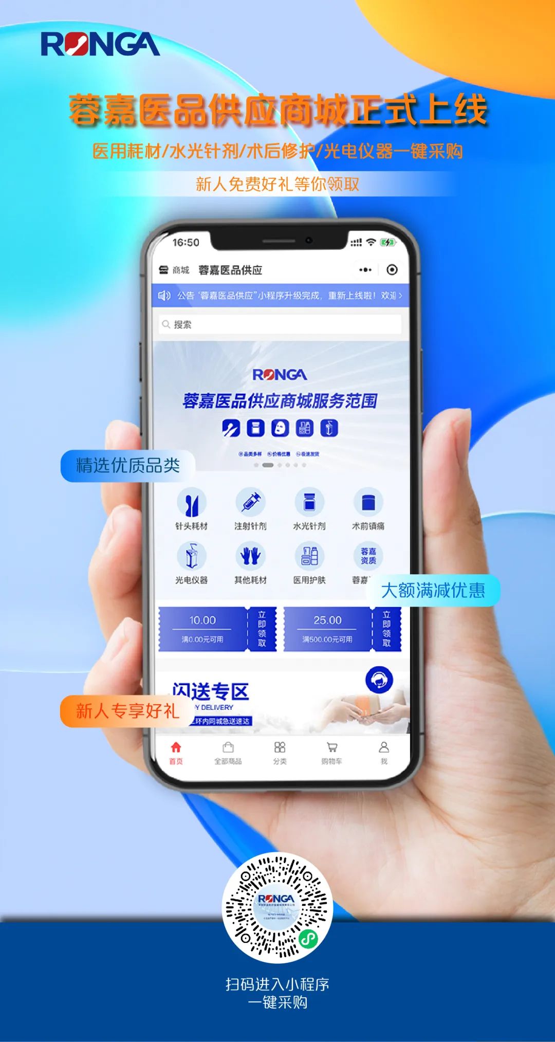 2023年2月,蓉嘉医疗器械打造的蓉嘉医品供应商城上线,云集优质医用耗材、水光针剂、术后修复产品及光电仪器等认证一、二、三类医疗器械耗材产品,为医美机构、皮肤管理中心提供耗材产品一站式采购服务。
