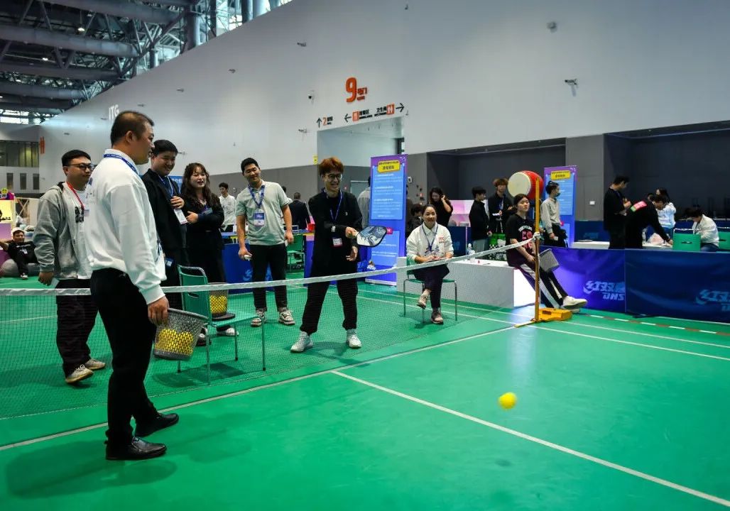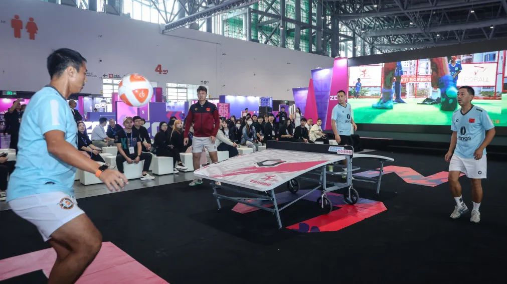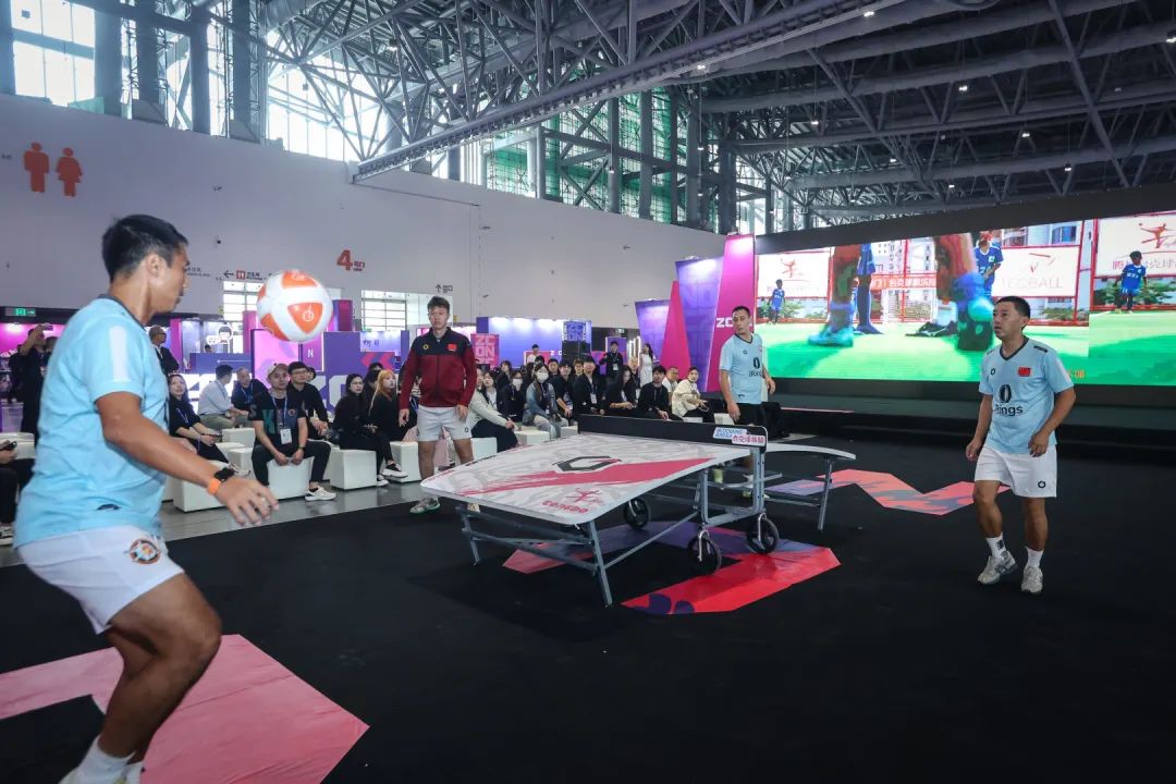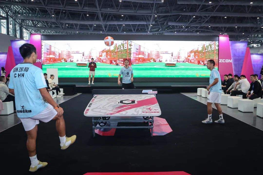 率先登场的是带来新兴竞技运动台克球表演的运动员们——2022年第五届台克球世锦赛上中国唯一参赛选手张俊鸣、孙掷旭、茆永清、阿穆。技法娴熟的他们围着球桌展示台克球运动的技巧,只见他们时而用脚踢球,时而用头顶球,配合十分默契!本届Zcon开展期间还将推出一系列台克球、街头足球活动,借助这样既能帮助强身健体、又能提高协调能力的运动宣扬“全民健身”的重要理念!