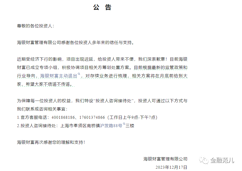 近期受经济下行的影响,项目出现迟延,给投资人带来不便,我们深表歉意!目前海银财富已成立专项小组,积极协调项目相关方筹划处置方案。目前根据最新的监管政策和行业导向,海银财富主动退出,对存续业务进行梳理,相关方案将在月底前给到大家,希望大家不信谣不传谣。