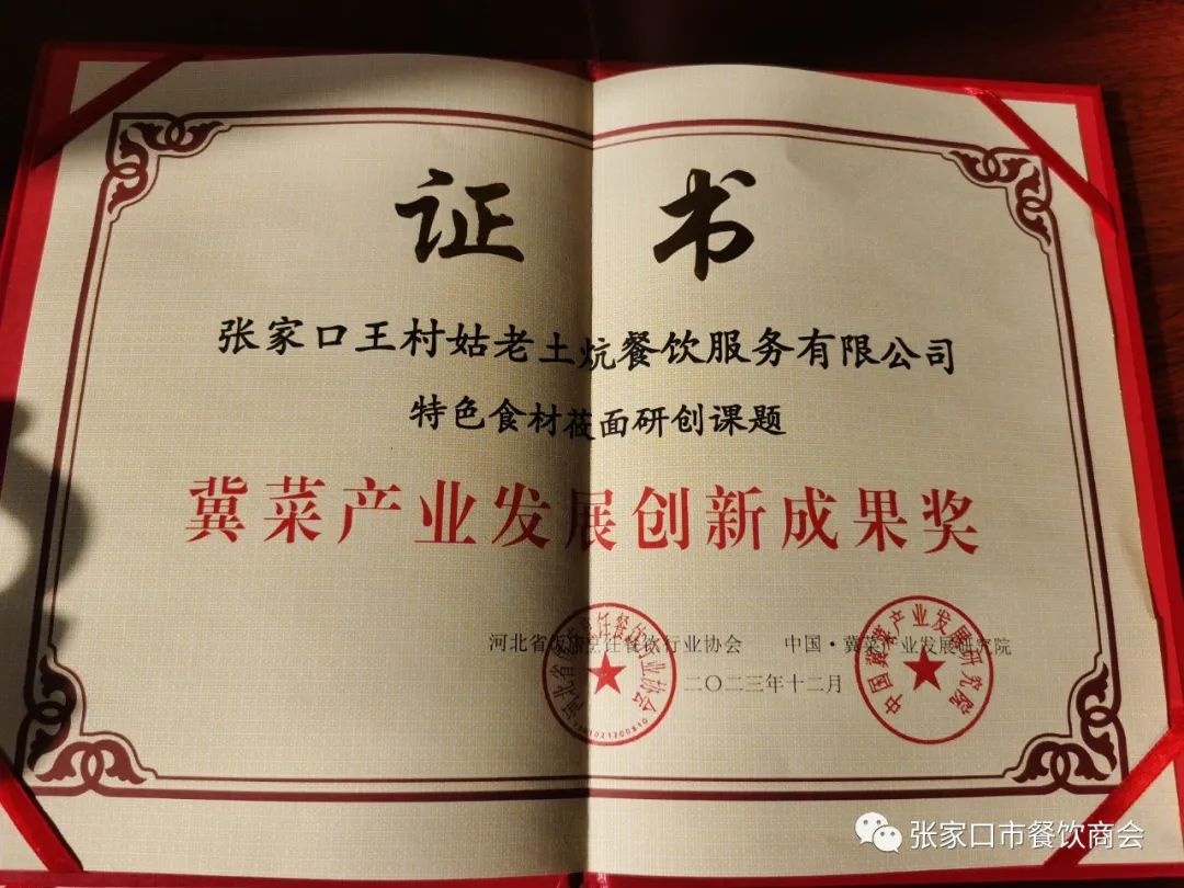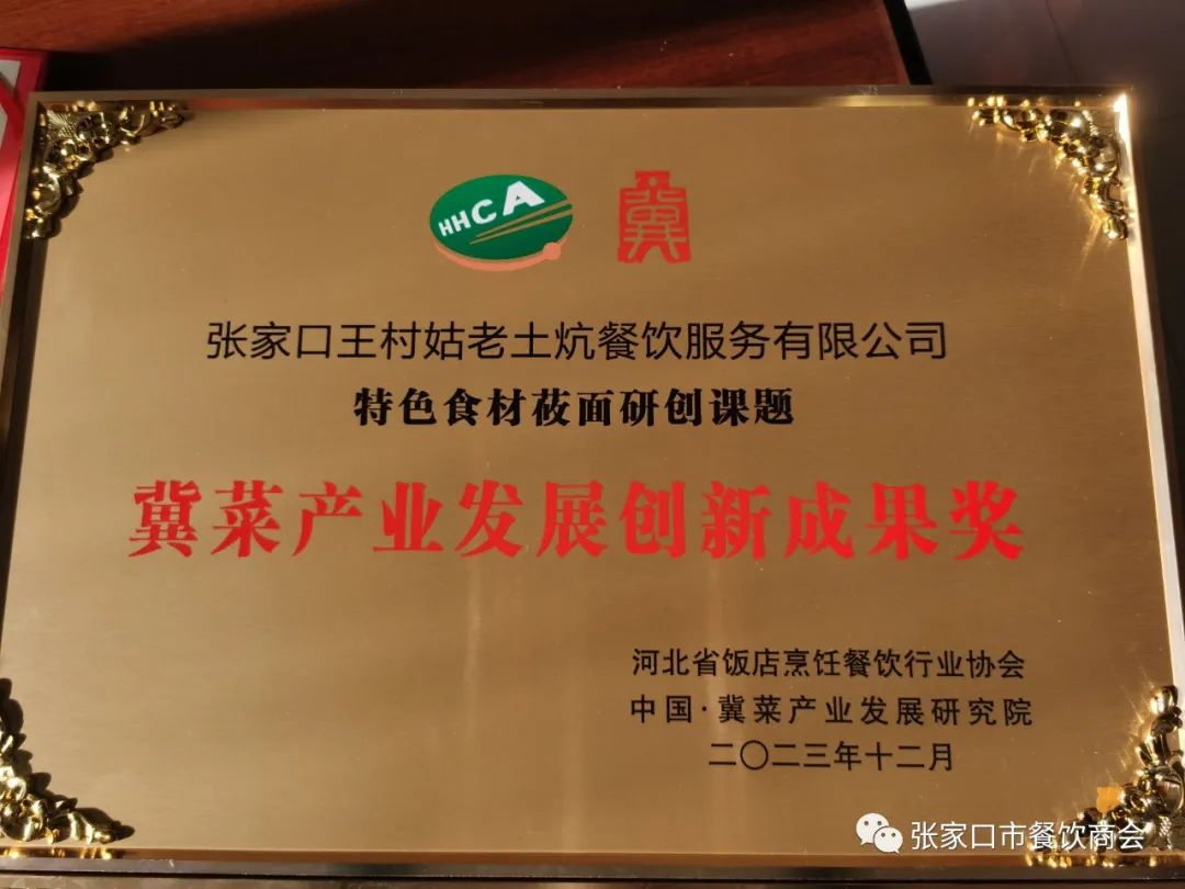 同时,在中国·冀菜产业发展研究院首批创新成果正式发布中,商会副会长、王村姑老土炕董事长王芳作为在菜品研发、经营模式、服务创新等方面取得显著成果的优秀企业之一向全省饭店餐饮行业发布了《张家口特色食材莜面的传承与创新》课题,以企业实战为基础,与餐饮行业同仁分享宝贵经验,并喜获“冀菜产业发展创新成果奖”。