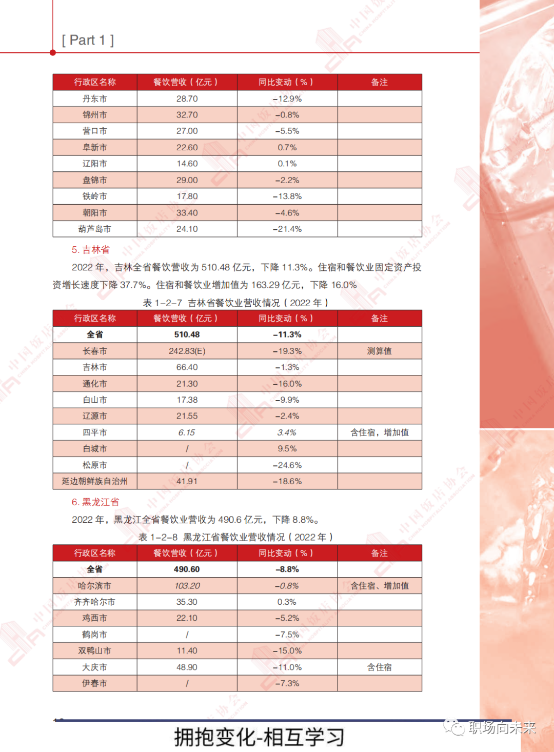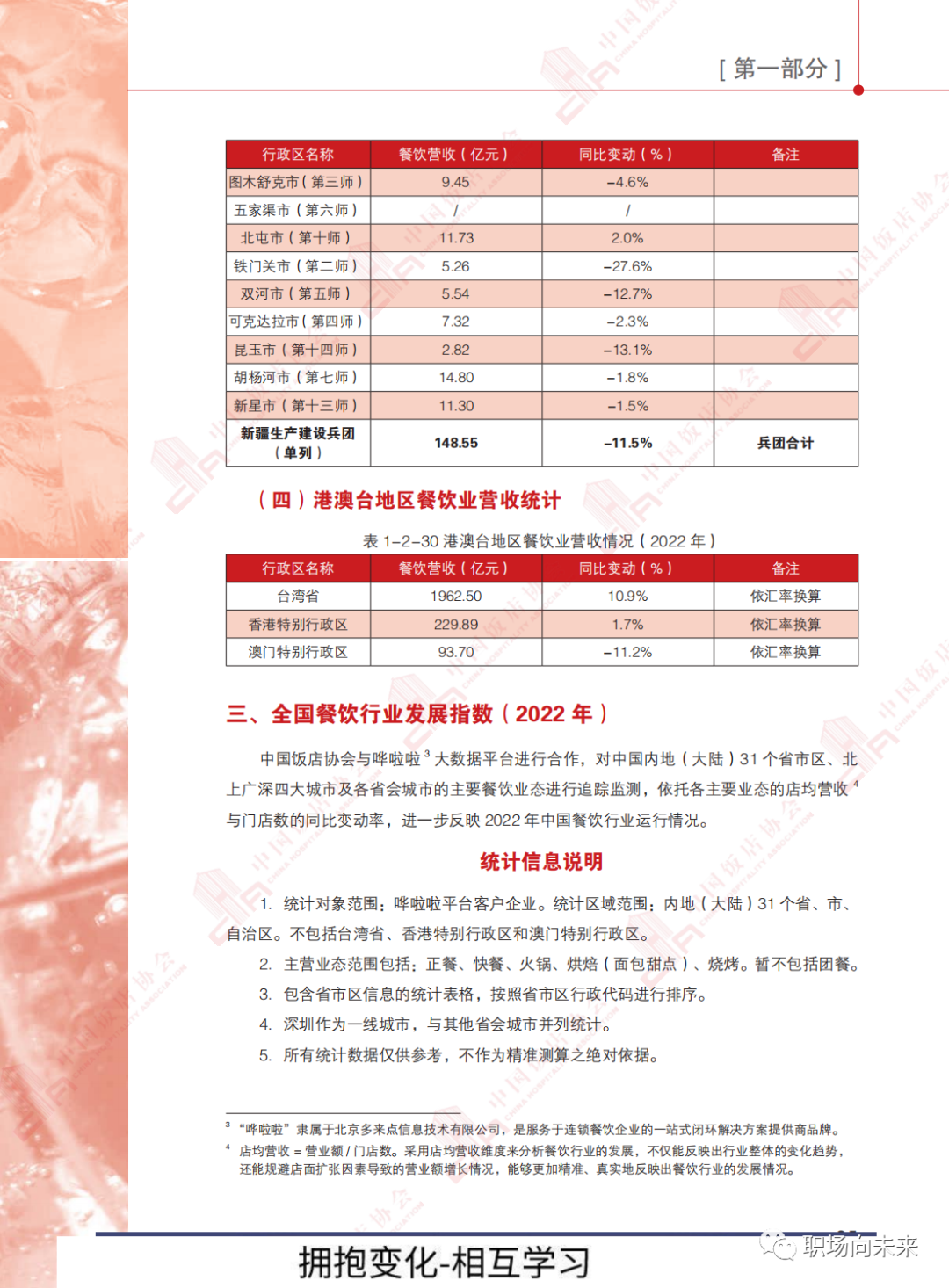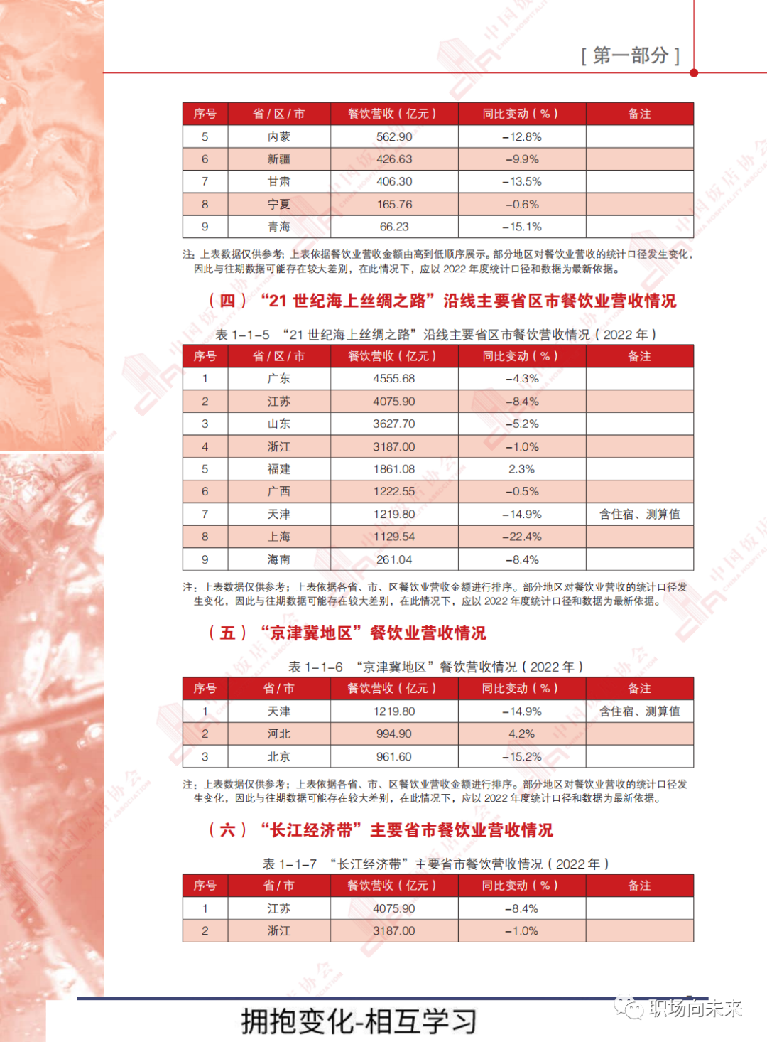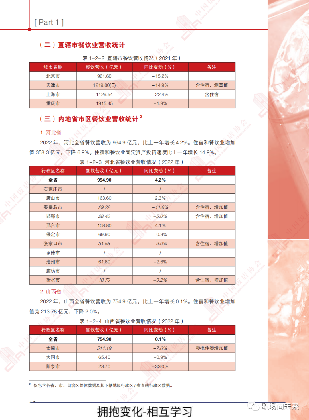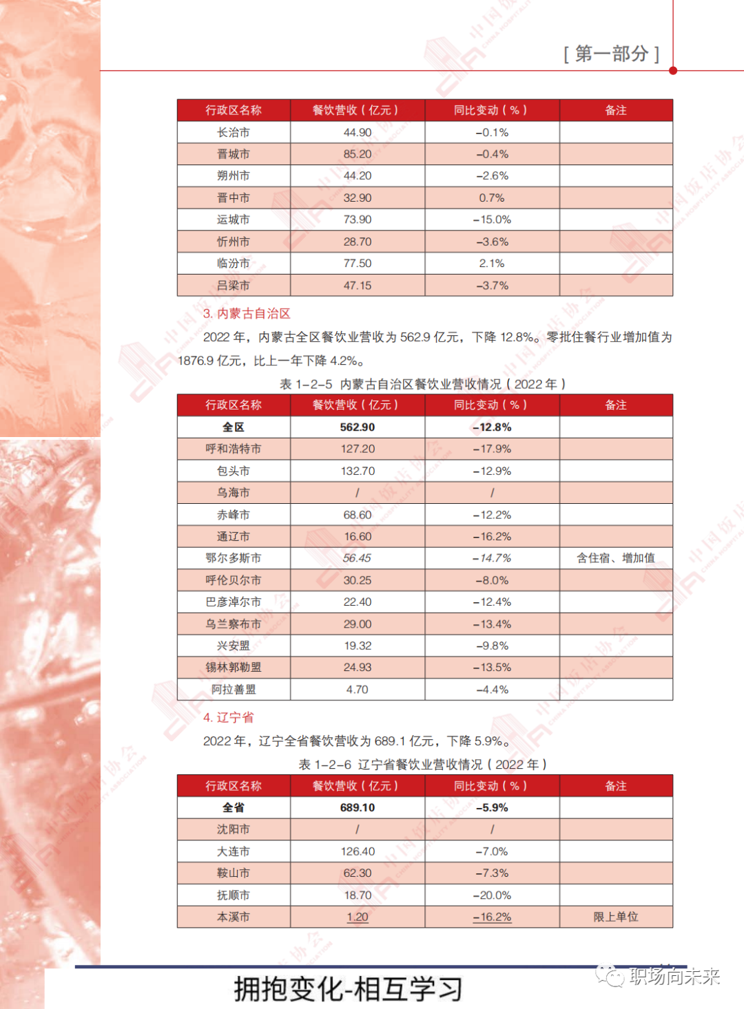 总体而言,受境外变异毒株持续输入影响,2022 年疫情多点频繁散发,餐饮行业波 动明显,市场受到较大冲击。全年行业收入同比增速仅在 1-2 月及 8 月呈现正值;3-5 月 受疫情影响出现明显低谷,此后呈缓慢回升趋势;而临近年底,疫情高发期来临,加上防 疫政策发生重大调整,新一轮大规模感染潮来袭,导致同比收入增速继续下滑。可以说, 2022 年全国餐饮行业营收情况,远要比前两年更为严峻。2022 年,河北全省餐饮营收为 994.9 亿元,比上一年增长 4.2%。住宿和餐饮业增加 值 358.3 亿元,下降 6.9%。住宿和餐饮业固定资产投资速度比上一年增长 14.9%。2022 年,山西全省餐饮营收为 754.9 亿元,比上一年增长 0.1%。住宿和餐饮业增加 值为 213.78 亿元,下降 2.0%。2022 年,内蒙古全区餐饮业营收为 562.9 亿元,下降 12.8%。零批住餐行业增加值为 1876.9 亿元,比上一年下降 4.2%。