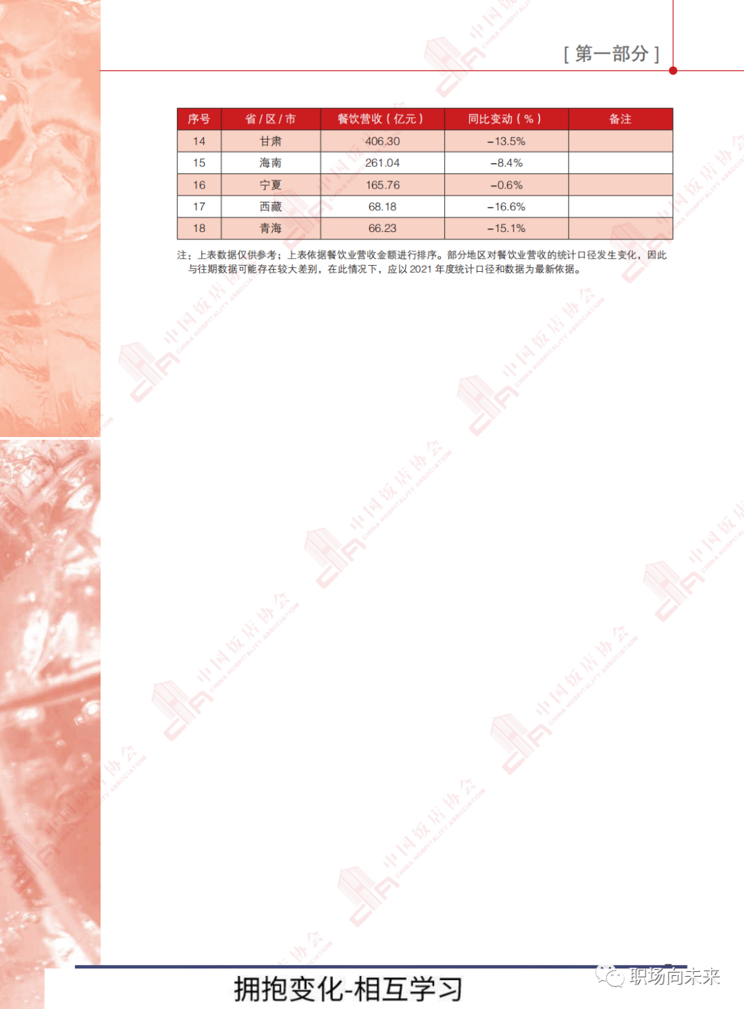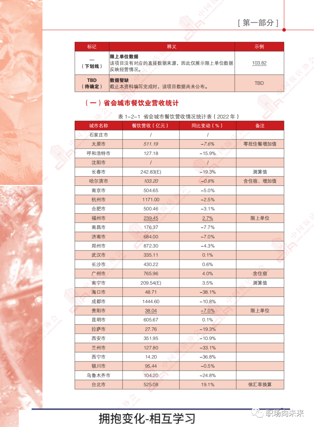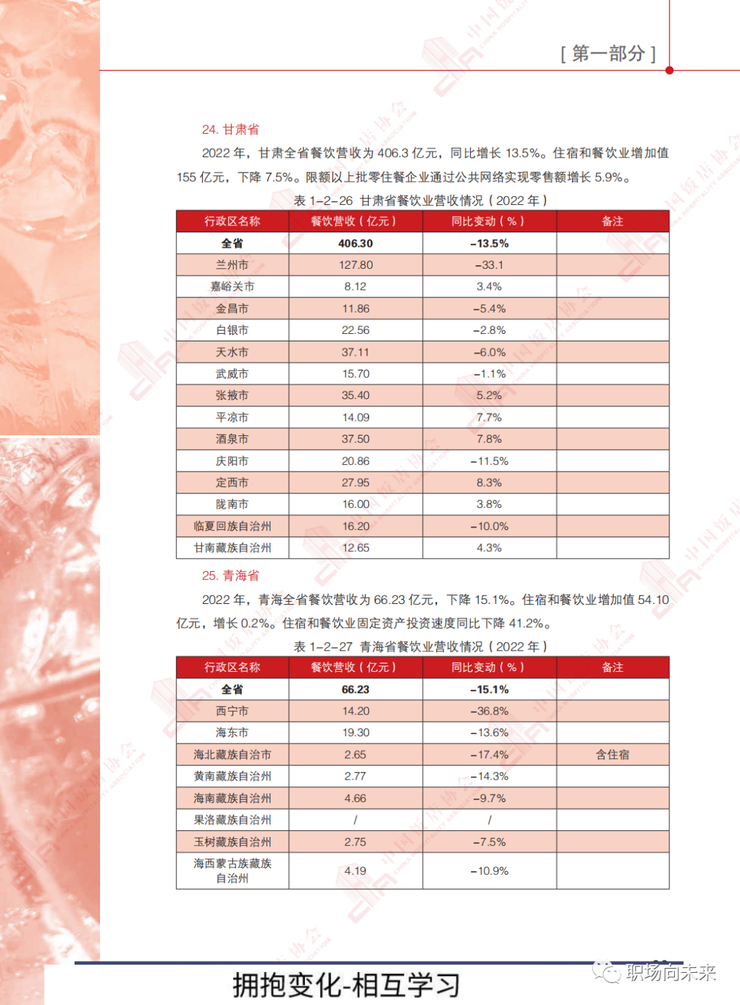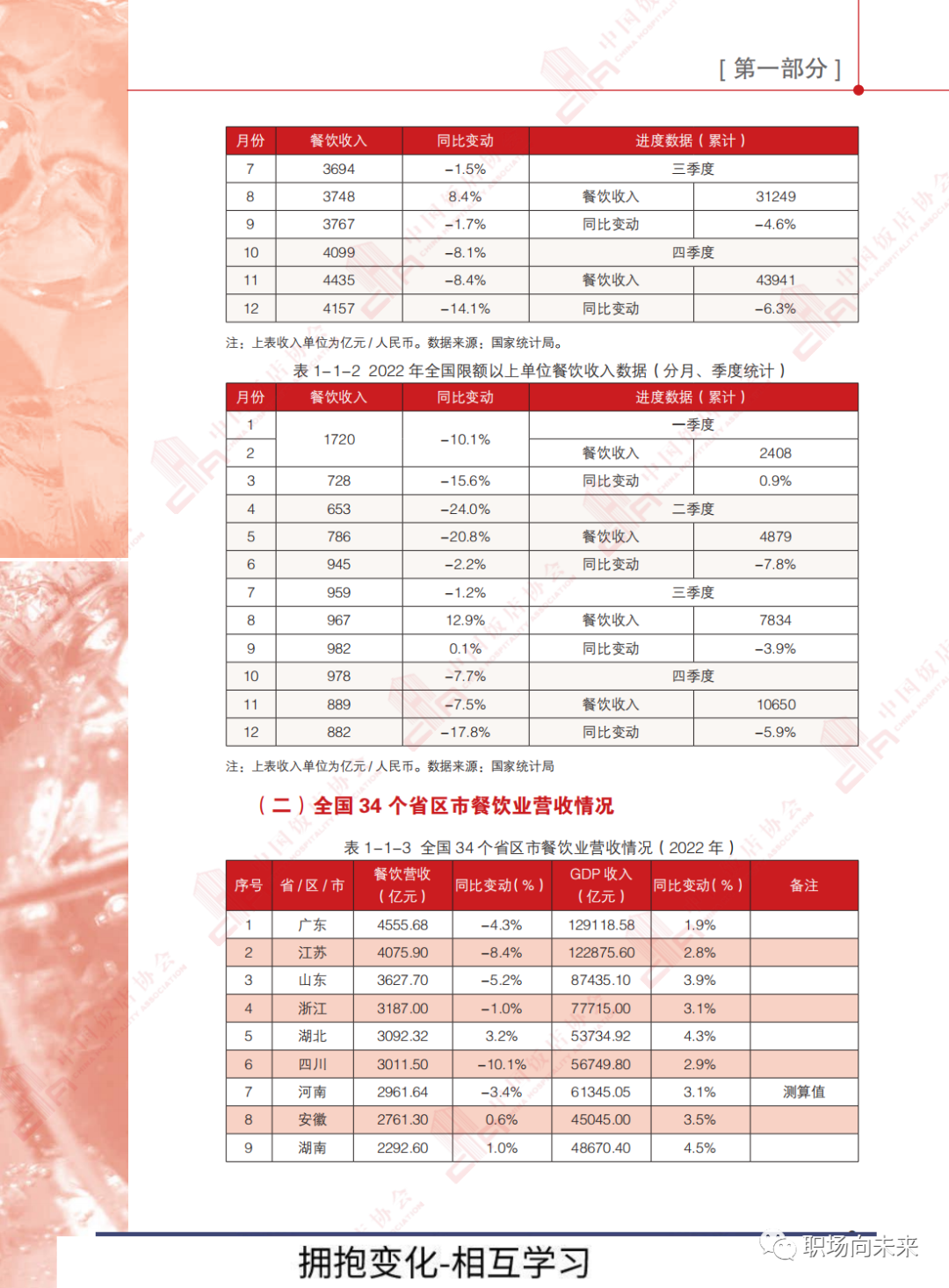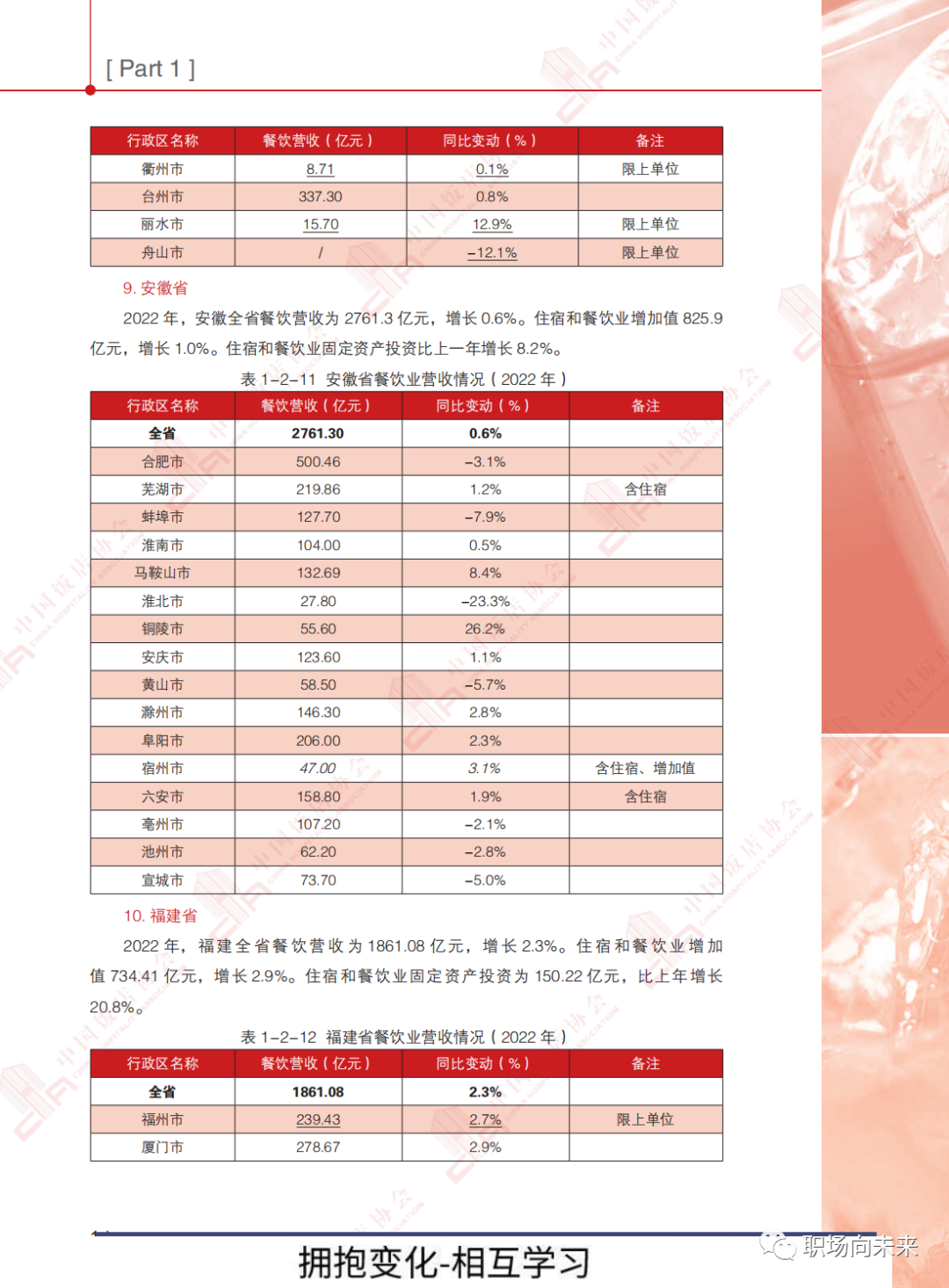 总体而言,受境外变异毒株持续输入影响,2022 年疫情多点频繁散发,餐饮行业波 动明显,市场受到较大冲击。全年行业收入同比增速仅在 1-2 月及 8 月呈现正值;3-5 月 受疫情影响出现明显低谷,此后呈缓慢回升趋势;而临近年底,疫情高发期来临,加上防 疫政策发生重大调整,新一轮大规模感染潮来袭,导致同比收入增速继续下滑。可以说, 2022 年全国餐饮行业营收情况,远要比前两年更为严峻。2022 年,河北全省餐饮营收为 994.9 亿元,比上一年增长 4.2%。住宿和餐饮业增加 值 358.3 亿元,下降 6.9%。住宿和餐饮业固定资产投资速度比上一年增长 14.9%。2022 年,山西全省餐饮营收为 754.9 亿元,比上一年增长 0.1%。住宿和餐饮业增加 值为 213.78 亿元,下降 2.0%。2022 年,内蒙古全区餐饮业营收为 562.9 亿元,下降 12.8%。零批住餐行业增加值为 1876.9 亿元,比上一年下降 4.2%。