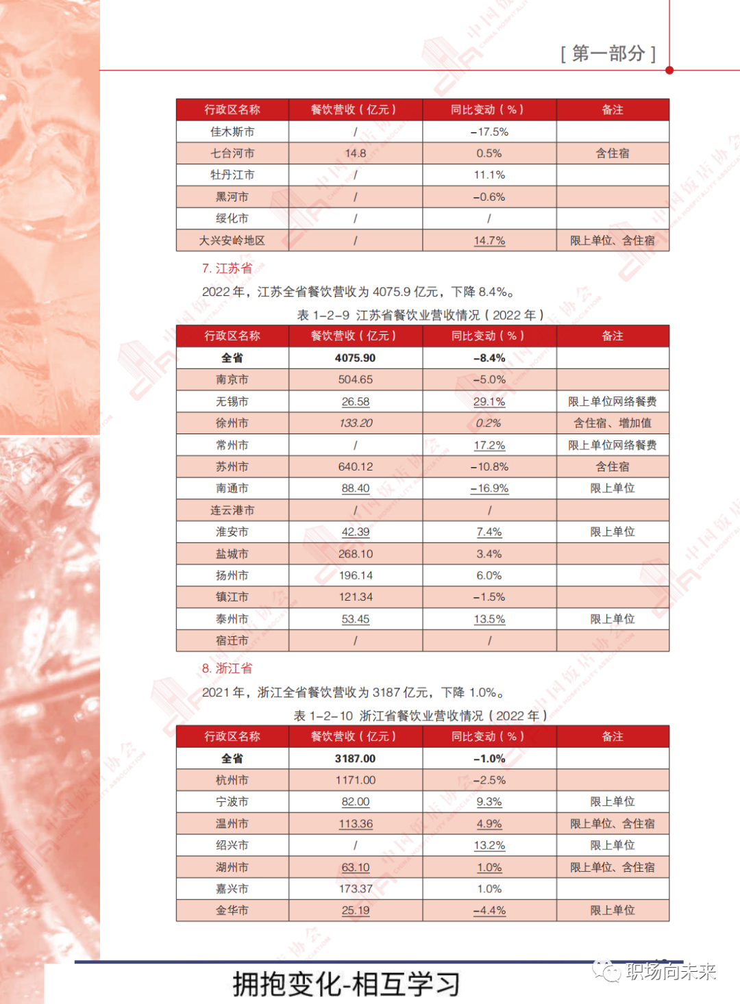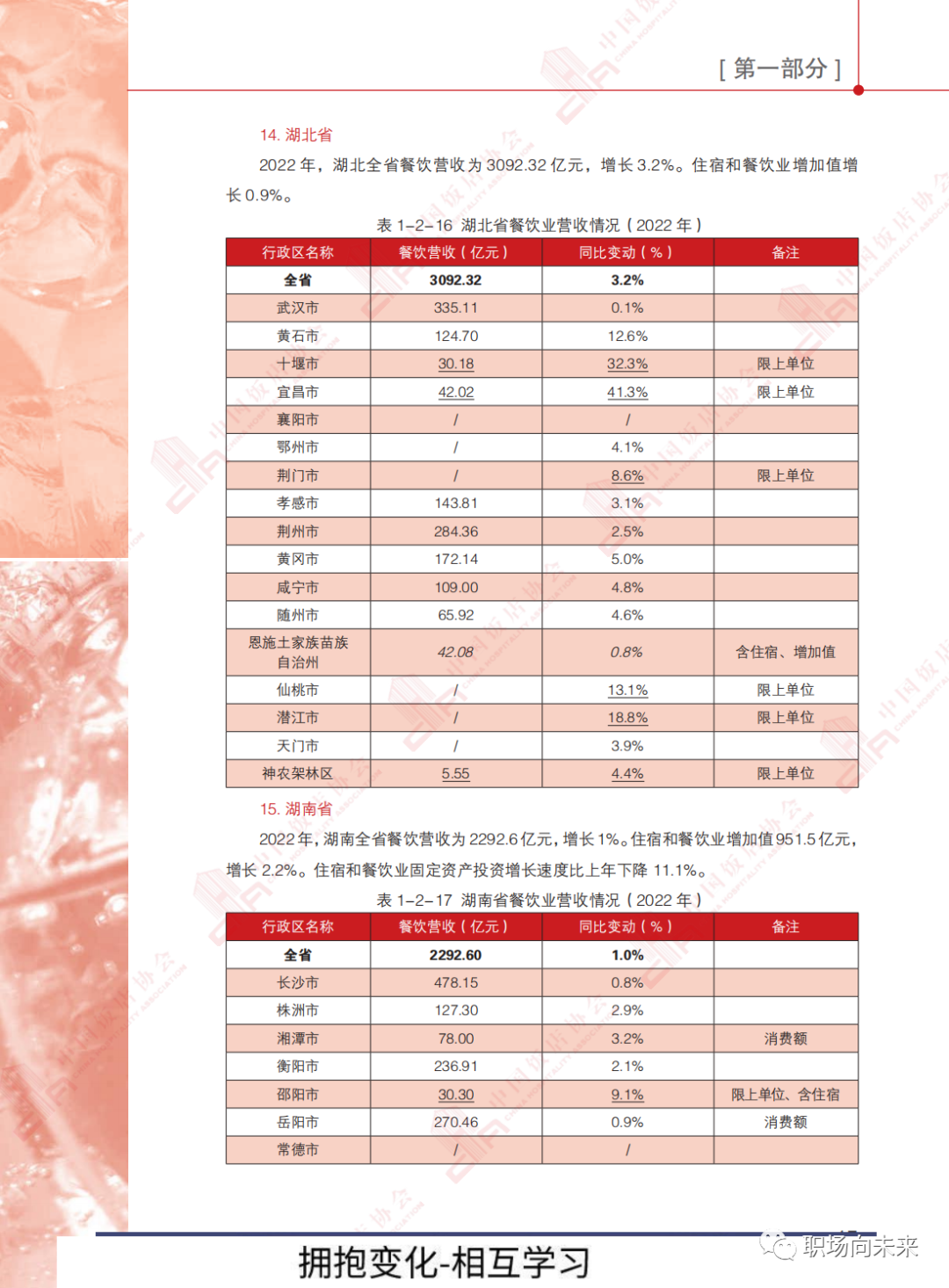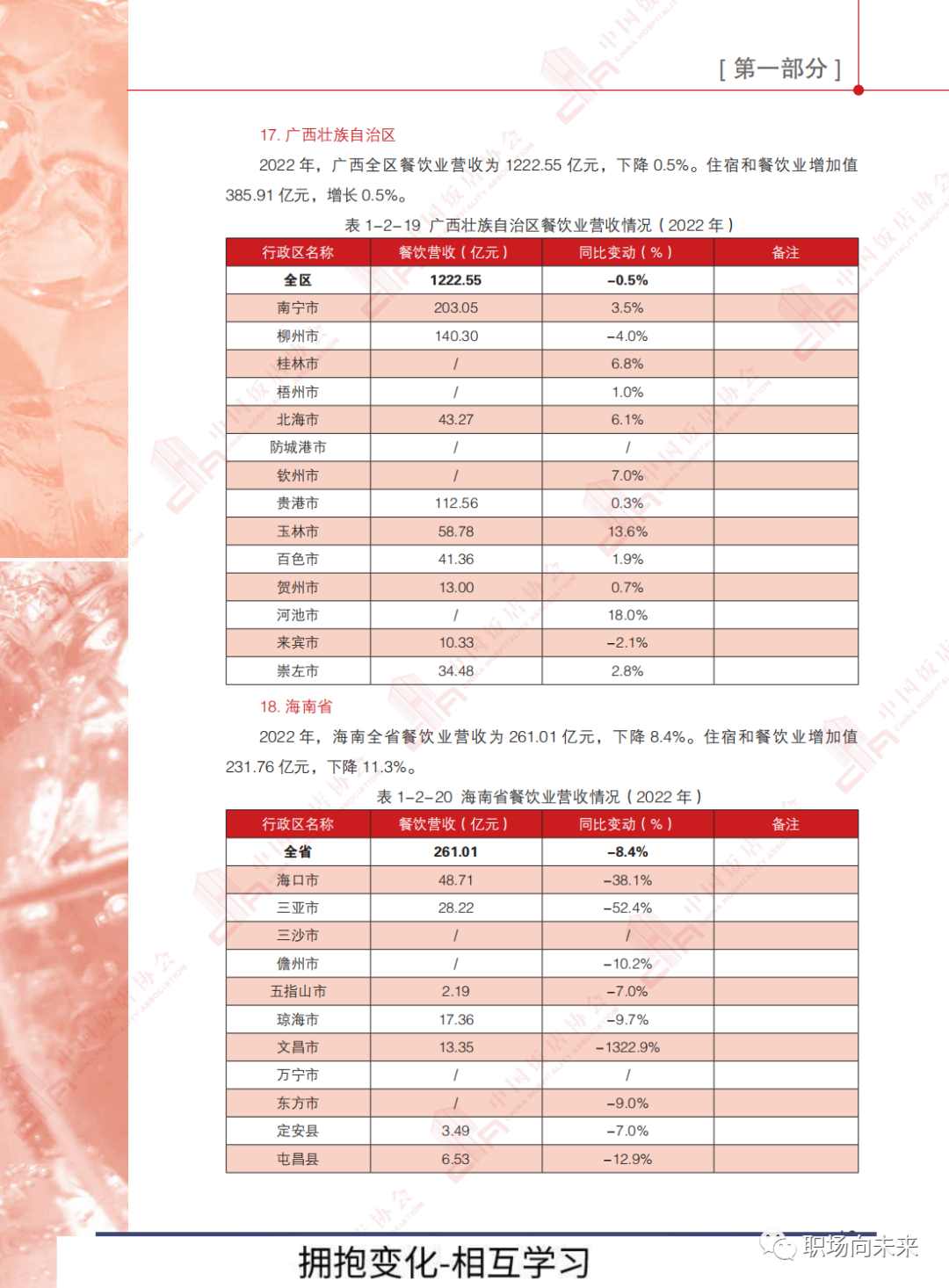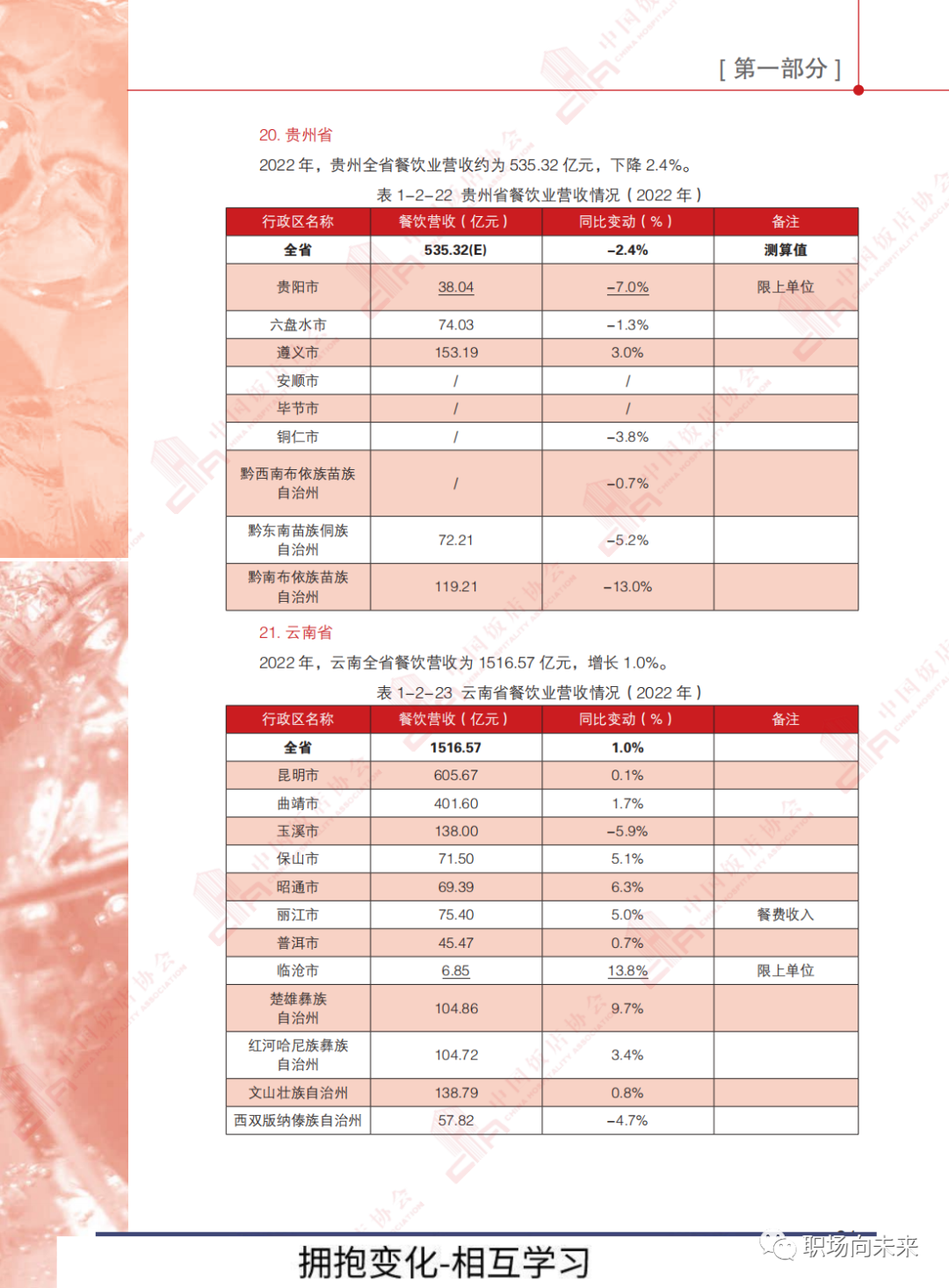 总体而言,受境外变异毒株持续输入影响,2022 年疫情多点频繁散发,餐饮行业波 动明显,市场受到较大冲击。全年行业收入同比增速仅在 1-2 月及 8 月呈现正值;3-5 月 受疫情影响出现明显低谷,此后呈缓慢回升趋势;而临近年底,疫情高发期来临,加上防 疫政策发生重大调整,新一轮大规模感染潮来袭,导致同比收入增速继续下滑。可以说, 2022 年全国餐饮行业营收情况,远要比前两年更为严峻。2022 年,河北全省餐饮营收为 994.9 亿元,比上一年增长 4.2%。住宿和餐饮业增加 值 358.3 亿元,下降 6.9%。住宿和餐饮业固定资产投资速度比上一年增长 14.9%。2022 年,山西全省餐饮营收为 754.9 亿元,比上一年增长 0.1%。住宿和餐饮业增加 值为 213.78 亿元,下降 2.0%。2022 年,内蒙古全区餐饮业营收为 562.9 亿元,下降 12.8%。零批住餐行业增加值为 1876.9 亿元,比上一年下降 4.2%。