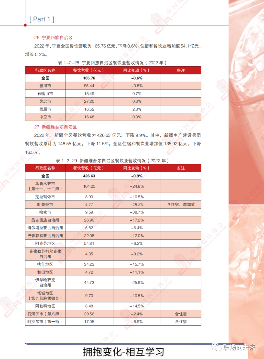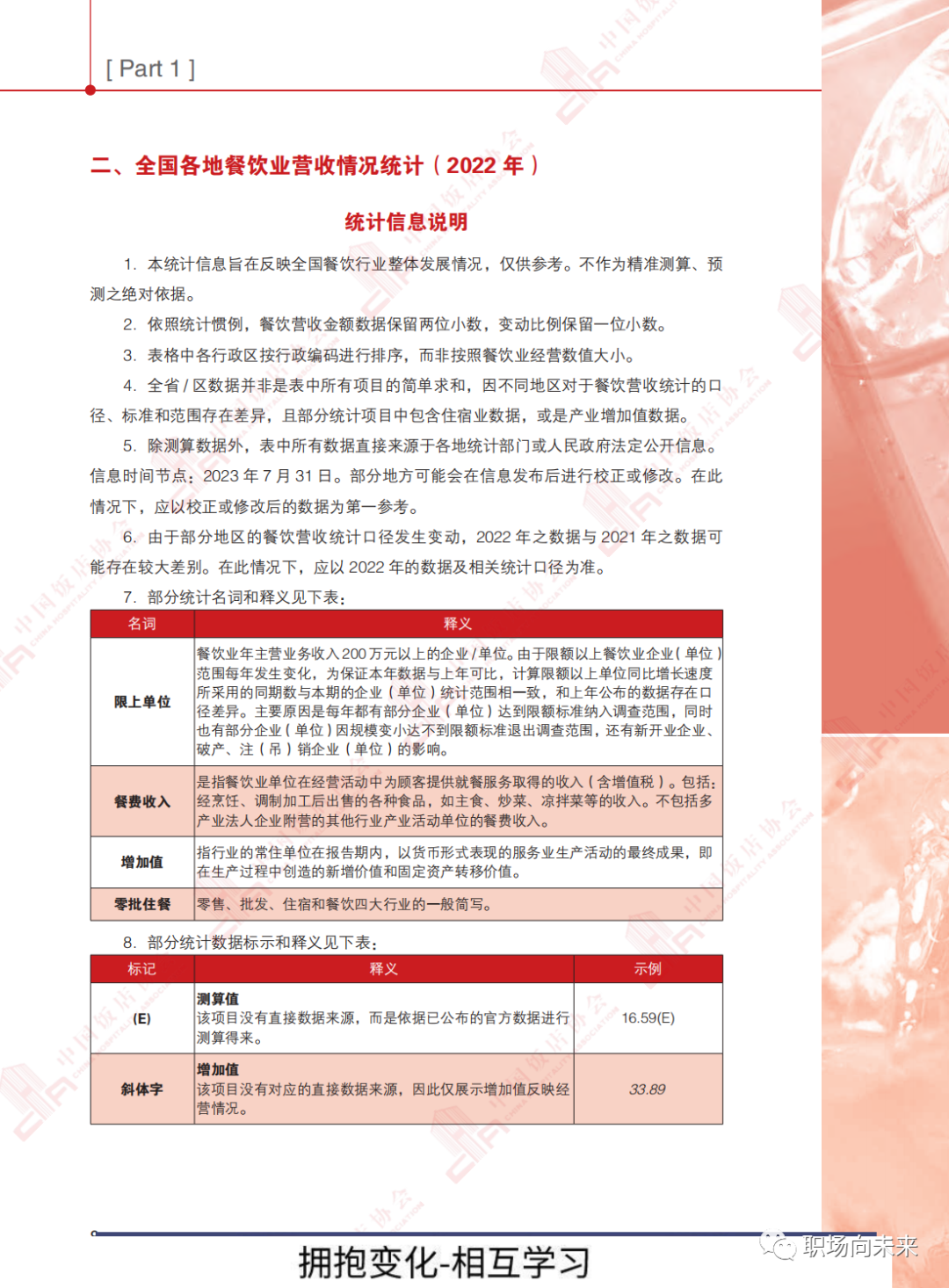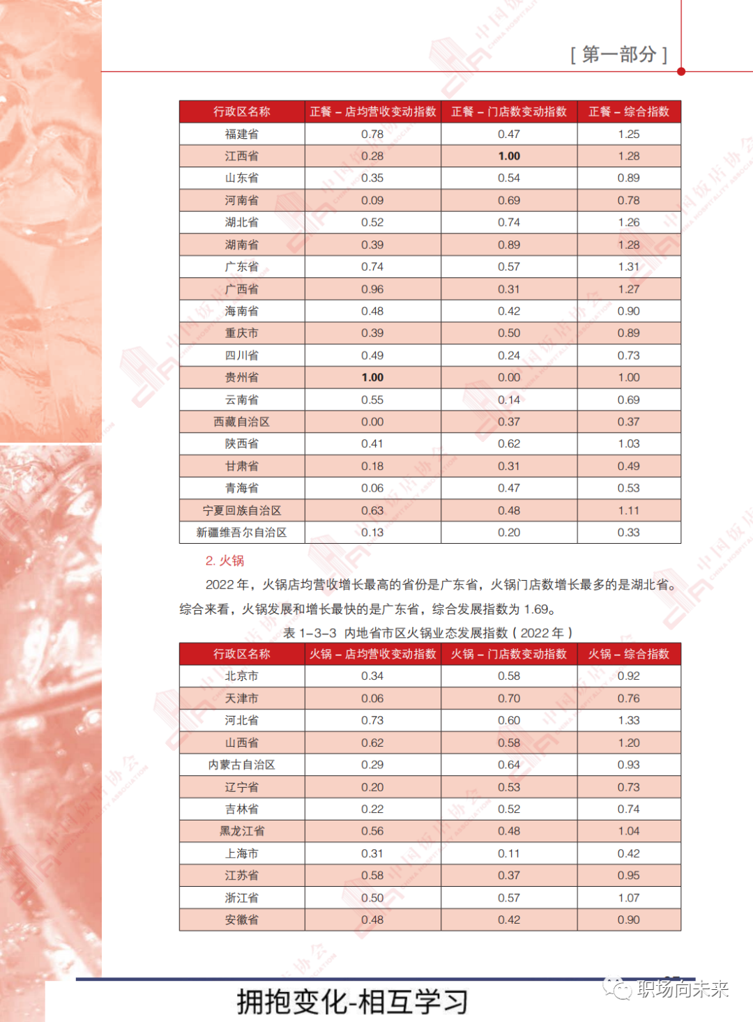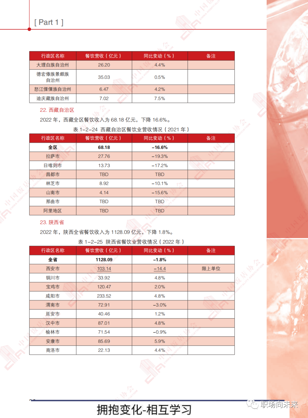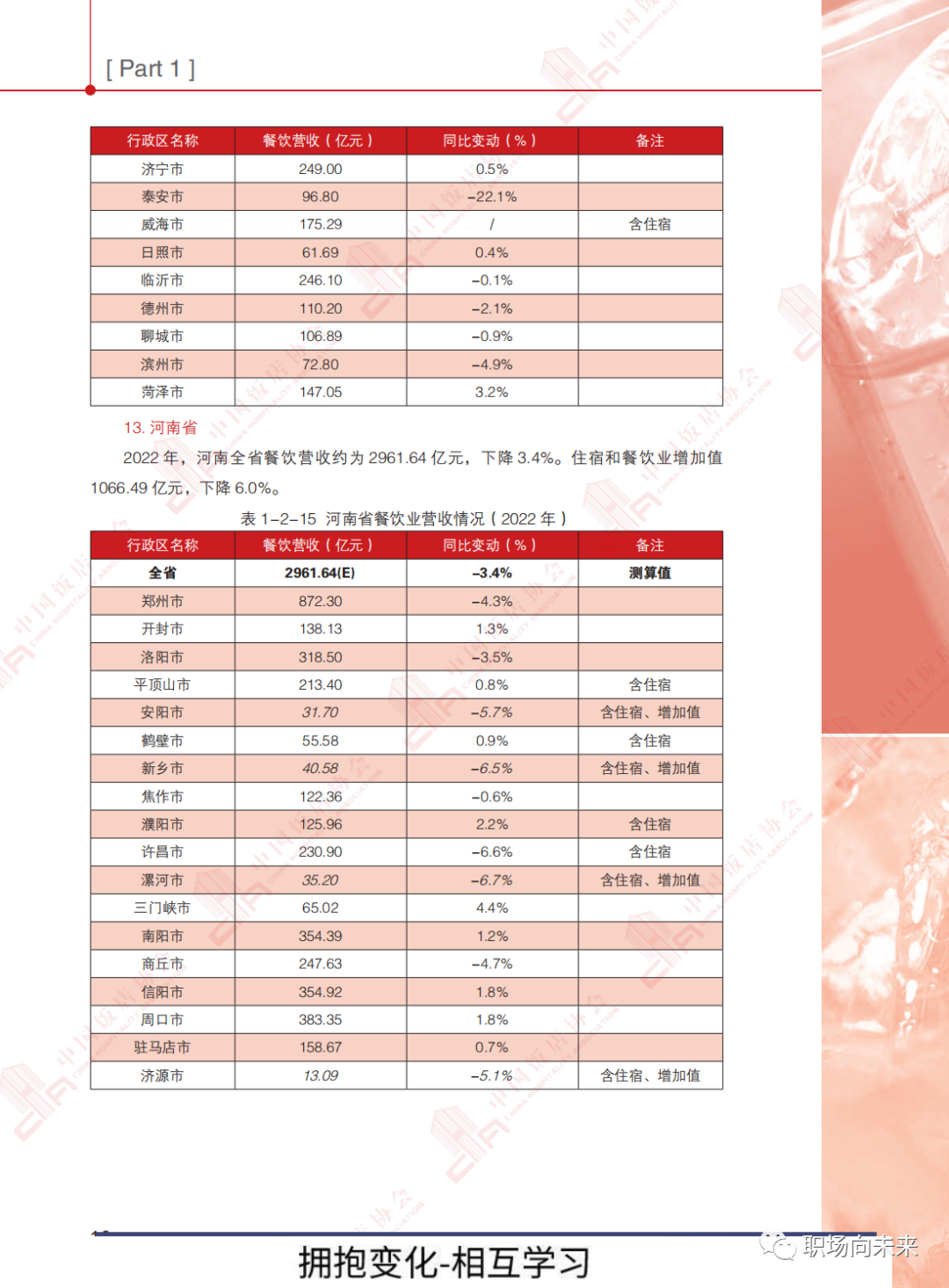 总体而言,受境外变异毒株持续输入影响,2022 年疫情多点频繁散发,餐饮行业波 动明显,市场受到较大冲击。全年行业收入同比增速仅在 1-2 月及 8 月呈现正值;3-5 月 受疫情影响出现明显低谷,此后呈缓慢回升趋势;而临近年底,疫情高发期来临,加上防 疫政策发生重大调整,新一轮大规模感染潮来袭,导致同比收入增速继续下滑。可以说, 2022 年全国餐饮行业营收情况,远要比前两年更为严峻。2022 年,河北全省餐饮营收为 994.9 亿元,比上一年增长 4.2%。住宿和餐饮业增加 值 358.3 亿元,下降 6.9%。住宿和餐饮业固定资产投资速度比上一年增长 14.9%。2022 年,山西全省餐饮营收为 754.9 亿元,比上一年增长 0.1%。住宿和餐饮业增加 值为 213.78 亿元,下降 2.0%。2022 年,内蒙古全区餐饮业营收为 562.9 亿元,下降 12.8%。零批住餐行业增加值为 1876.9 亿元,比上一年下降 4.2%。