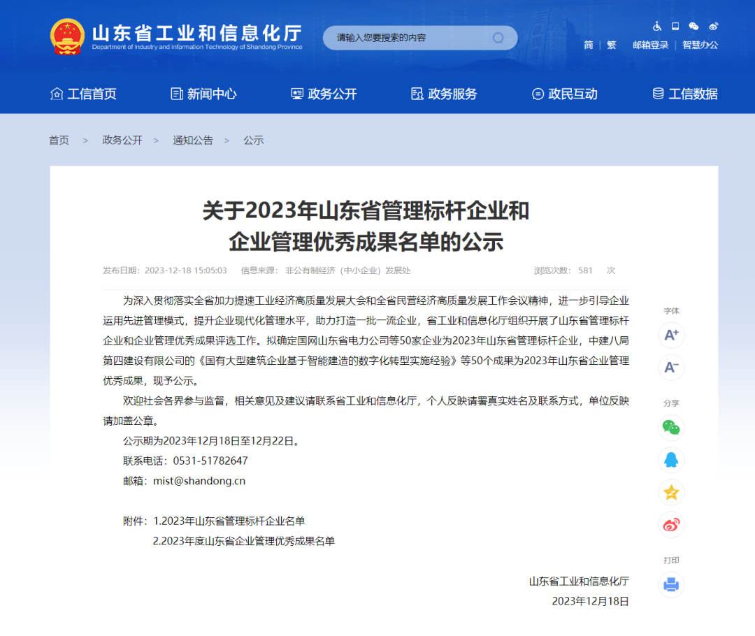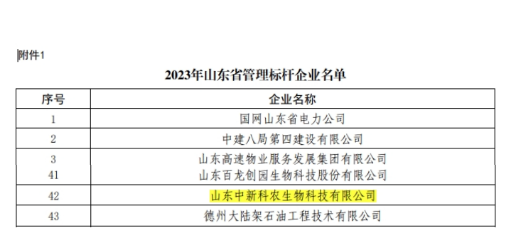 12月18日,山东省工业和信息化厅公示了2023年山东省管理标杆企业和企业管理优秀成果名单,我县山东中新科农生物科技有限公司入选2023年山东省管理标杆企业名单,全市共有3家。