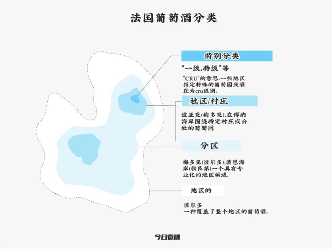 地域:这是指最广泛的 AOC。例子:波尔多,勃艮第。 次区域:在这些地区中,有一些较小的次区域,以更具体的葡萄酒或风土而闻名。例子:波尔多的梅多克次产区,勃艮第的夏布利次产区。 公社/村庄:在一个次区域内进一步缩小,这些区域的范围有时只有几英里。例子:梅多克的波亚克,夏布利的欧塞尔海岸。 特殊分类:在这一点上,AOC可以进一步指定质量,表示Cru,它指的是一个特定的葡萄园或一组葡萄园,通常以质量而闻名。