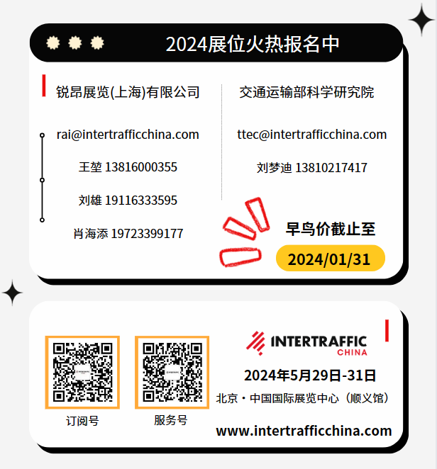 【INTERTRAFFIC】主办声明!尊敬的各参展单位与合作伙伴,2024 Intertraffic China 国际交通工程、智能交通技术与设施展览会由交通运输部科学研究院及锐昂展览(上海)有限公司联合举办,没有授权其他单位进行招商和收款工作。为保障各利益相关方的合法权益,请广大厂商留意关注,勿将展位费或参与展览的相关费用支付给其他号称为本届展览组织方的单位。交科院与锐昂展览竭诚为您服务,期待Intertraffic China成功举办,欢迎有意参与的企业及合作方与我们联系!