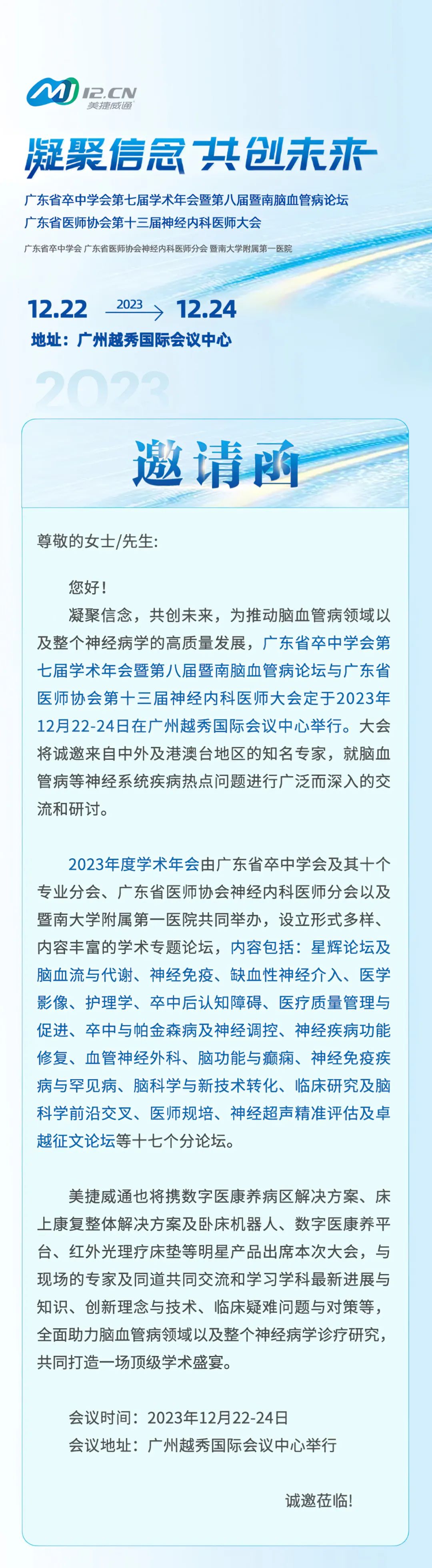展会预告 | 美捷威通邀您共聚广东省卒中学会第七届学术年会暨第八届暨南脑血管病论坛与广东省医师协会第十三届神经内科医师大会