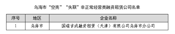 为有效规范我市融资租赁行业市场秩序,加强完善行业监管,根据内蒙古自治区地方金融监督管理局《关于做好非正常经营类融资租赁公司监管工作的通知》(内金监发〔2023〕55号)文件要求,现对我市截至2023年11月末非正常经营类融资租赁公司进行公告。同时,郑重提醒社会各方审慎评估相关非正常经营类企业风险,切实防范自身利益受到损害。