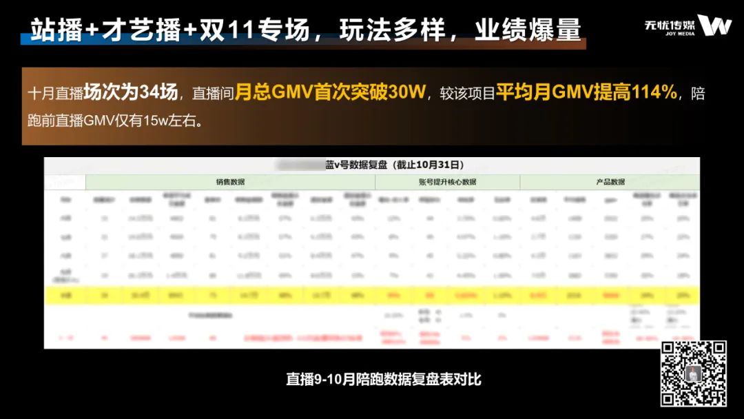 调整后,十月直播场次为34场,直播间月总GMV首次突破30w,较服务前平均月GMV提高114%