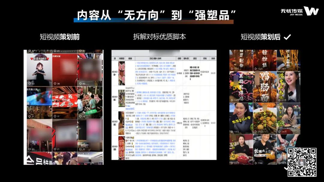 一个月的时间,从问题账号到2倍营收;从粉丝大杂烩到精准定位;从小白团队到专业写、剪、拍、播,这些成果成为该火锅品牌继续在新媒体赛道走下去的底气。