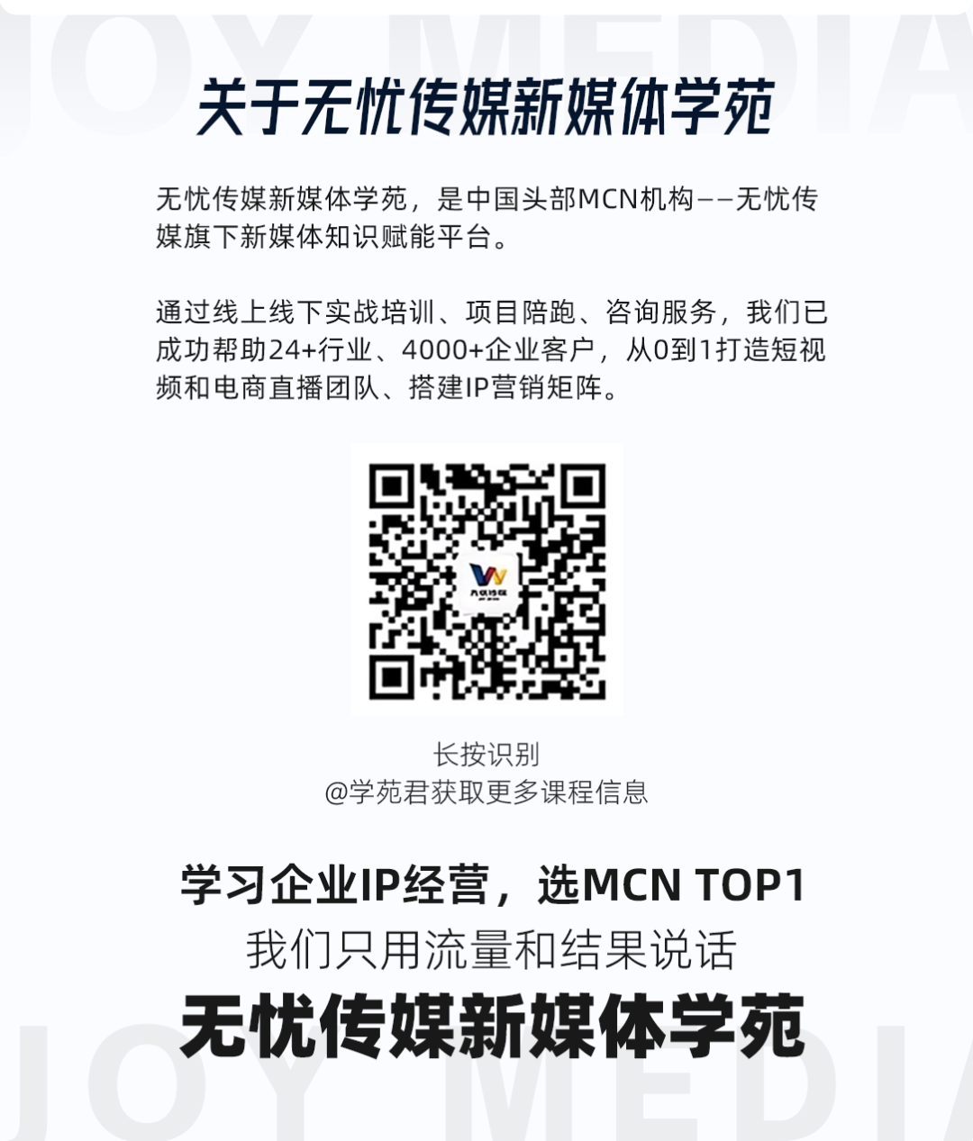 无忧学苑浓缩无忧传媒7年经验,用10w+达人和3000+企业的孵化经验,赋能企业正确方法,帮助企业节约时间。