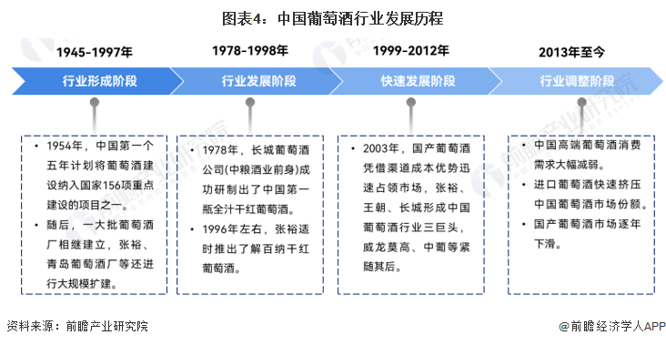 中国葡萄酒行业的发展主要经历了四个阶段:行业形成阶段(1945-1997年)、行业发展阶段(1978-1998年)、快速发展阶段(1999-2012年)和行业调整阶段(2013年至今)。随着中国宏观经济增速放缓、国家限制“三公消费”、“八项规定”等有关政策规定的出台,中国高端葡萄酒消费需求大幅减弱。同时,受海外直采比重增加、“零关税”政策等的影响,进口葡萄酒快速挤压中国葡萄酒市场份额。国产葡萄酒市场逐年下滑,至2022年底,国产葡萄酒产量和葡萄酒行业销售收入仍呈现双下降态势。