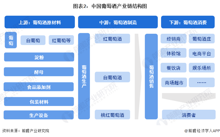 葡萄酒产业链中上游主要为葡萄的种植,此外还涉及淀粉、酵母、食品添加剂、包装及生产设备等,中游为葡萄酒的制造,下游为消费渠道,具体有经销商、葡萄酒庄、体验店、电商平台等,最后到达终端消费者。