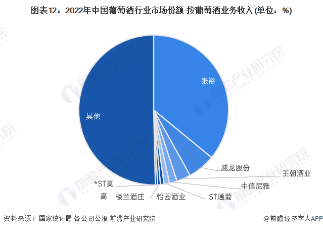 根据国家统计局数据,2022年,我国规模以上葡萄酒生产企业销售收入为79.04亿元。按代表性企业葡萄酒业务营收占行业整体销售收入的比重来看,张裕公司以36%的占比稳居第一;威龙股份排名第二,市场份额为6%;王朝酒业占比3%,排名第三。