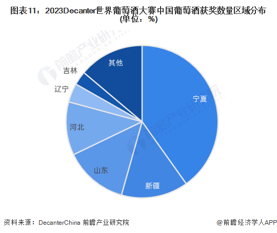 Decanter世界葡萄酒大赛是世界最大规模也是影响力最深远的葡萄酒比赛,2023年中国赛区共有274款葡萄酒获得了奖牌。其中,宁夏以110款获奖酒再次蝉联DWWA奖牌榜首位,占比40.1%;新疆和山东分列二、三位,奖牌数量分别为39枚和37枚,占比分别为14.2%和13.5%。
