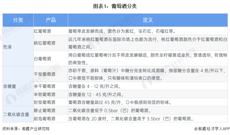 葡萄酒产品可按色泽、含糖量、二氧化碳含量进行分类,具体如下: