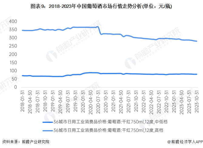 2018-2023年,我国葡萄酒行业高档产品和中低档产品价格呈现相反的变化趋势。高档葡萄酒价格下降趋势,尤其在2020年发生暴跌,主要源于新冠疫情肺炎的影响,高档葡萄酒价格受市场需求影响力度较大;中低档葡萄酒产品价格则稳中带升。2018年初高档葡萄酒和中低档葡萄酒价格分别为347.00元/瓶和71.48元/瓶,到2023年10月,高档葡萄酒价格降至281.6元/瓶,中低档葡萄酒价格则升至80.09元/瓶。