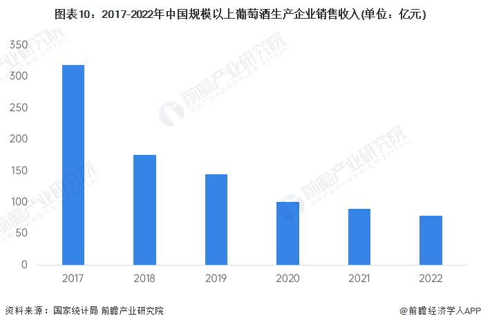 随着我国葡萄酒消费量的不断减少,国产葡萄酒企业正面临着巨大的挑战,规模以上企业销售收入不断下滑,从2017年的318.83亿元下滑至2022年的79.04亿元。绝大部分葡萄酒生产经营企业经营困难,行业总体仍处于亏损边缘。