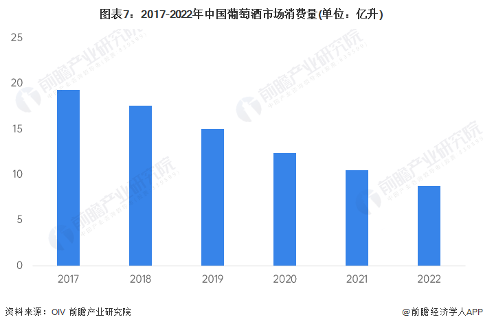 目前,我国国内仍未能形成浓厚的葡萄酒消费氛围,大多数消费者尚未养成经常饮用葡萄酒的习惯,导致行业抵抗风险能力偏弱。近两年来,在疫情和烈酒的冲击下,我国葡萄酒市场消费量大幅下滑,2022年葡萄酒市场消费量仅为8.8亿升,同比下降16%。
