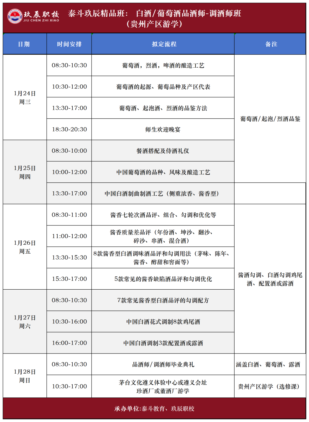 为了深入贯彻国家人社部《技能人才队伍建设实施方案》的文件精神,加强酒业技能人才队伍建设,玖辰职校与泰斗教育联袂在贵阳举办一场名为“精品班:白酒/葡萄酒中级品酒师-调酒师班(赠贵州产区游学)”的活动。这个班级不仅涵盖了白酒、葡萄酒和黄酒的品鉴技能,还为成绩合格者颁发相应级别的证书,并辅导考至国家人社部中级品酒师。届时,由众多名师领衔的专家组将现场为学员们授课,用他们的专业知识和经验,引领学员们在酒的世界中探索和发现更多的奥秘。