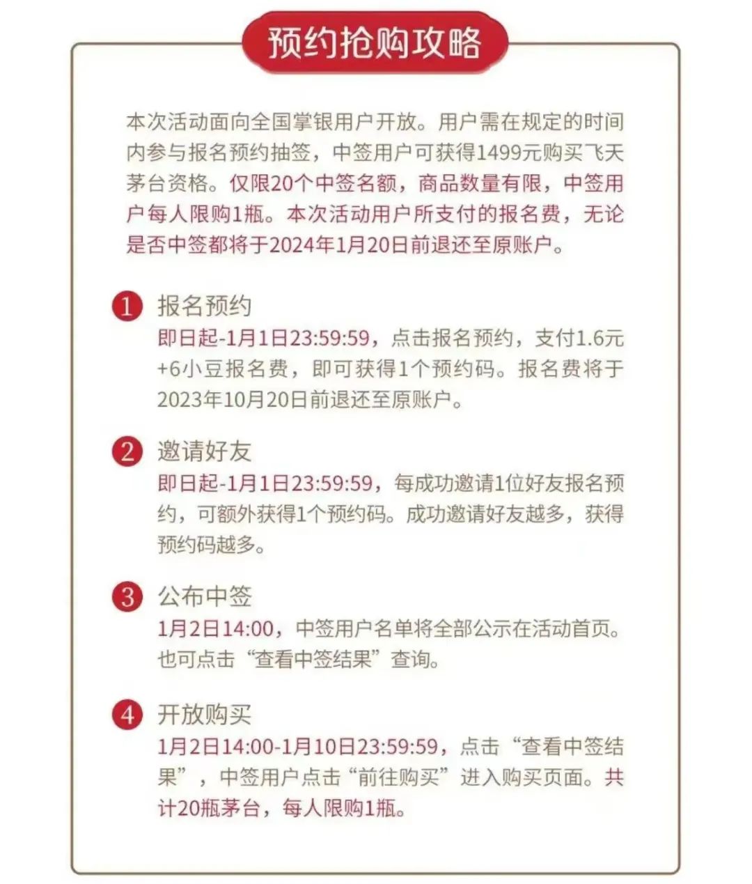 仅限20个中签名额,商品数量有限,中签用户每人限购一瓶,本次活动用户所支付的报名费,无论是否中签都将2024年1月20日前退还至原账户,
