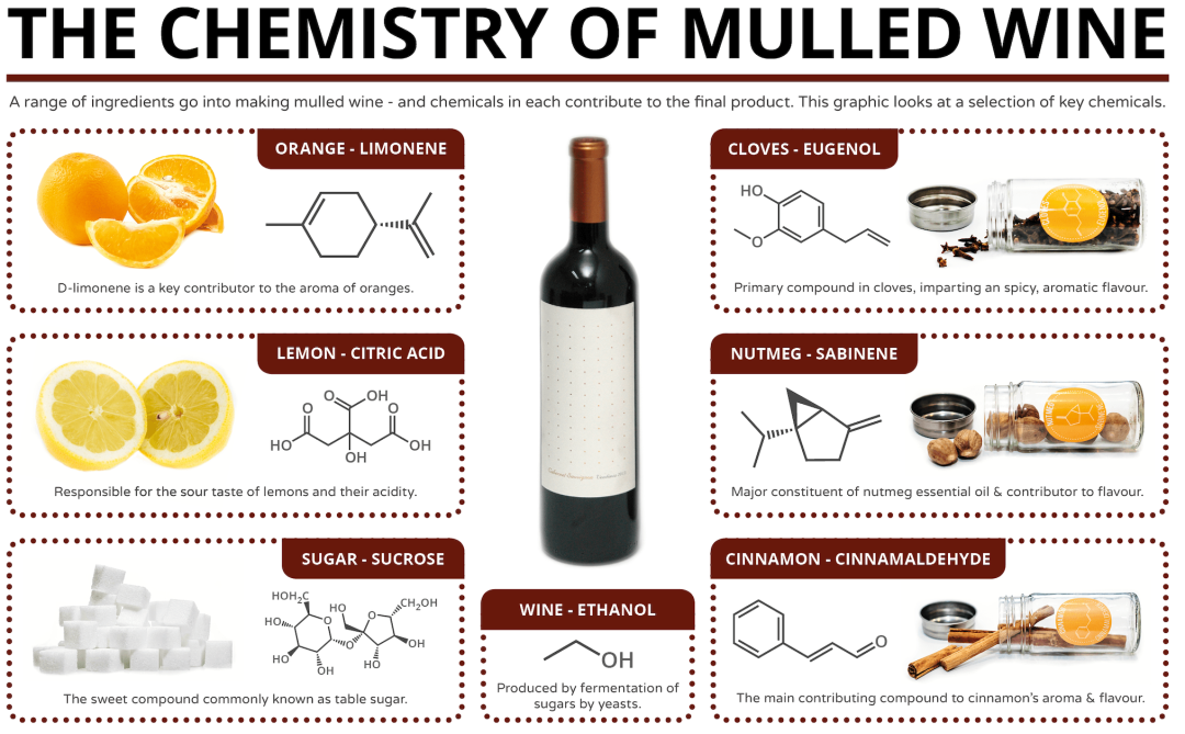 热红酒(Mulled Wine)的起源并不难追溯。几个世纪以来,香草和香料一直被人们用来掩盖变质食物和饮料的味道。香料不仅可以隐藏变质的味道,还可以将食物转化为更多感官参与的美好体验。热红酒就是这样一种东西,它的起源是古希腊。当时的人们觉得聚会上剩下的旧酒不喝完就会被浪费,所以添加了香料和调味剂,下锅煮沸,以延长旧酒的保质期。后来,罗马人在欧洲征战时期,为了抵御寒冷,便效仿古希腊人将红酒煮沸后饮用。热红酒也随着罗马帝国版图的逐步扩大,在其他地方流传开来。为了适应当地的饮食习惯,热红酒也在不同地方发展出了不同版本。但比较基础的材料是,苹果、橙子、柠檬、八角、肉桂棒和丁香……首先在锅中加入切片的苹果(稍微切得厚一点)、橙子和柠檬(去籽),然后加入红酒,等锅烧热以后转小火煮10分钟,根据口味加入冰糖,八角。煮完静置一会儿,倒入放有橙子片的杯中,用肉桂棒搅拌,热红酒就做好了。相比于普通红酒,热红酒的口味会更加丰富,酒味较淡。那么,除了口感上的区别以外,热红酒还有什么特别之处吗?布尔诺兽医学与药物科学大学的研究人员比较了普通红酒和热红酒的相对密度、酸度、酒精含量、总酚含量和抗氧化能力。结果表明,与普通红酒相比,添加了丁香等香料的热红酒样品的总酚含量和抗氧化能力明显升高,且酒精含量明显下降。热红酒中包含的化学物质|Andy Brunning不过,就算酒精含量很低,还是有不少人喝完后会脸红、心跳加快,熟悉的头疼也来了。与大量饮酒后第二天的宿醉不同,喝红酒的人常常会在喝了一小杯后的30分钟内或者3个小时内出现“红酒头痛(RWH)”,而饮用白葡萄酒或其他酒制品却不会出现这种情况。没有人能确切的知道为什么喝红酒会引发头痛,很多人猜测可能与喝酒后脑血管扩张、血糖变化、酒精过敏、血压升高等因素有关,也有人觉得是因为红酒的品质不够好,喝到了假酒。之前也有科学家提出理论认为是因为红酒中含有亚硫酸盐和组胺物质,因为许多葡萄酒都含有有关亚硫酸盐的警告标签。但其他研究反驳了这些想法,因为亚硫酸盐仅影响1%的人口,干果和午餐肉等加工食品比红酒含有更多的亚硫酸盐,并且对亚硫酸盐过敏的人会出现呼吸困难和红疹,但不会引起头痛。组胺的确会存在于发酵产品中,例如葡萄酒、陈年奶酪和酸菜。红酒中的组胺平均比白葡萄酒多20%~200%。不过,专家认为对于某些人来说,即使饮料中不含组胺,饮酒也可能导致血浆组胺水平升高。在一项对16名对红酒不耐受的人进行的一项研究发现,红酒不耐受的人对低组胺葡萄酒和高组胺葡萄酒的反应没有差异,也就是说红酒中的高组胺含量并不是引起“红酒头痛”的罪魁祸首。