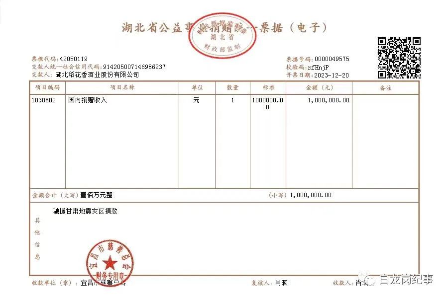 12月20日,稻花香酒业公司通过宜昌市慈善总会,向甘肃地震灾区捐款100万元,驰援抗震救灾、受灾群众安置、灾后重建等工作。