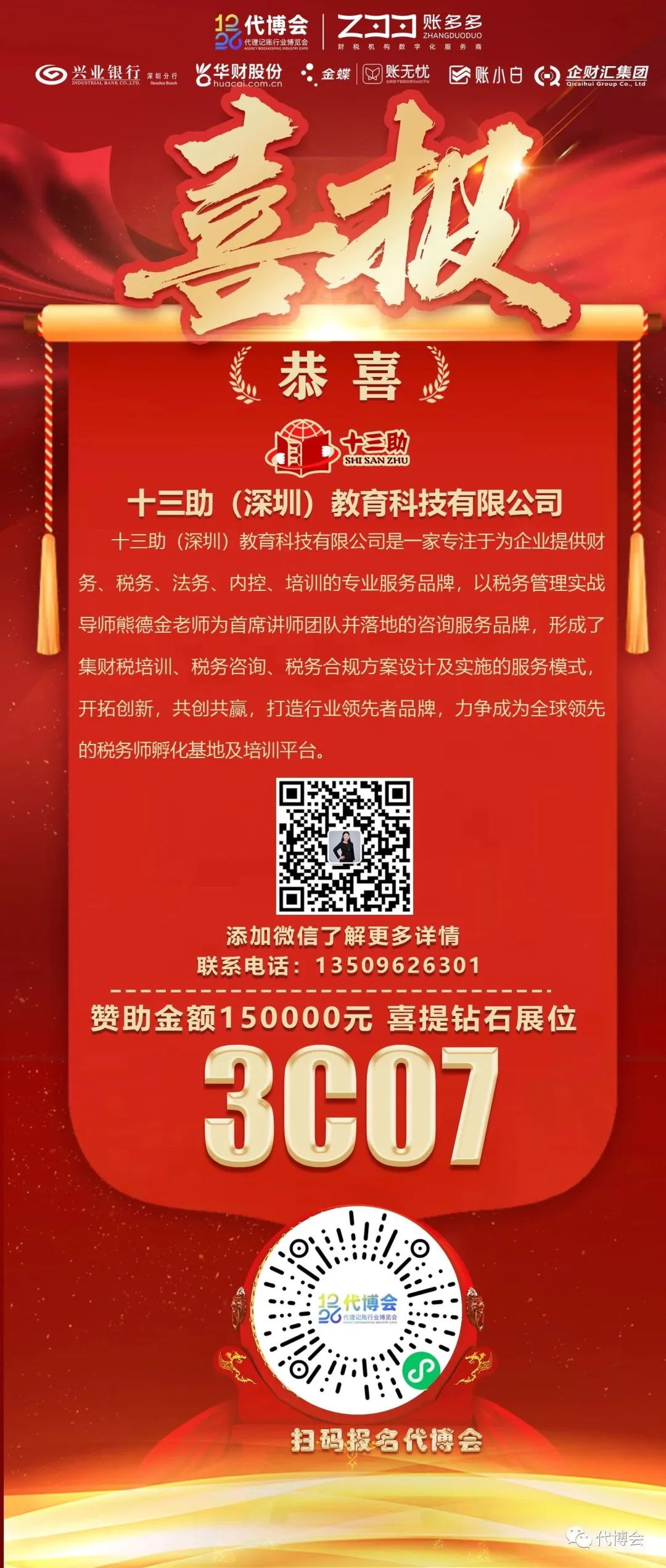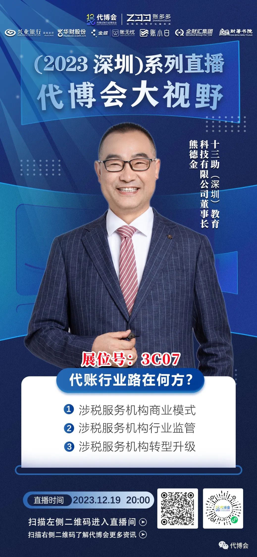 2023年12月19日晚上8点,本期为“1226代博会大视野”系列直播的第32期,特邀嘉宾为十三助(深圳)教育科技有限公司董事长 熊德金 ,分享《代账行业路在何方?》。本期【代博会】视频号多人观看,感谢同行朋友一如既往的支持和收看。