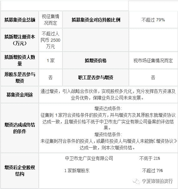 受委托,宁夏锦德拍卖行有限公司将在上海文化产权交易所对中卫市龙广实业有限公司增资项目进行公开挂牌交易: