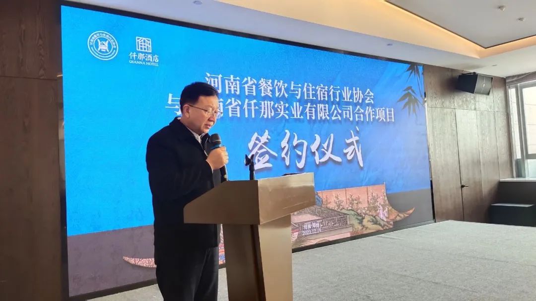河南省餐住协副会长兼秘书长宋春亭主持签约仪式并介绍协会发展概况,陈坤峰介绍仟那酒店集团的发展历程和概况,河南省餐住协驻会副会长兼住宿委员会主席孙学奇分享住宿业行业现状,河南省餐住协驻会副会长蒋辉宣读新增补副会长单位、协会住宿委员会执行主席和名誉主席名单,河南省餐住协专家委员会主席郭京普为新增补副会长单位、住宿委员会执行主席和名誉主席颁发牌匾和证书。