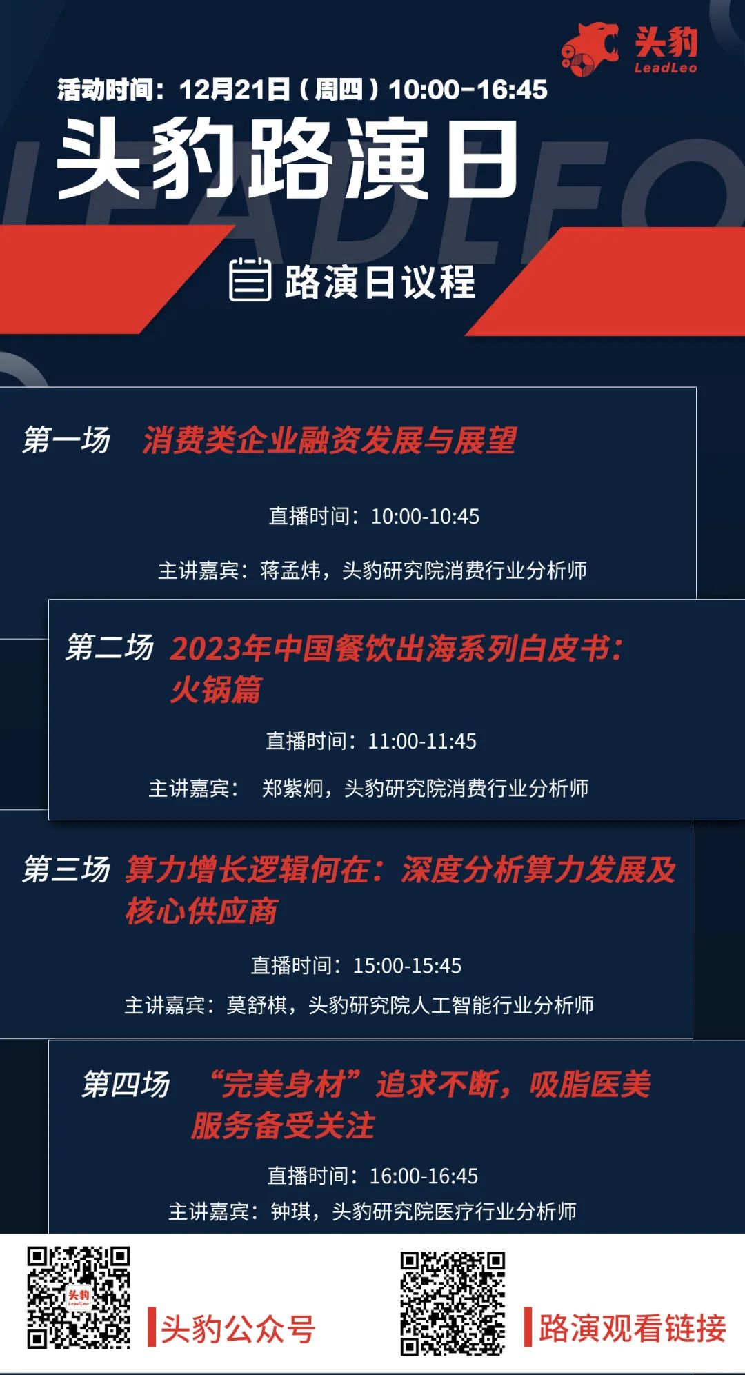 12月21日,头豹路演日如期而至。本期路演日,四位头豹分析师将分别为大家带来关于消费、餐饮出海、算力、吸脂等行业领域的精彩分享,敬请期待。