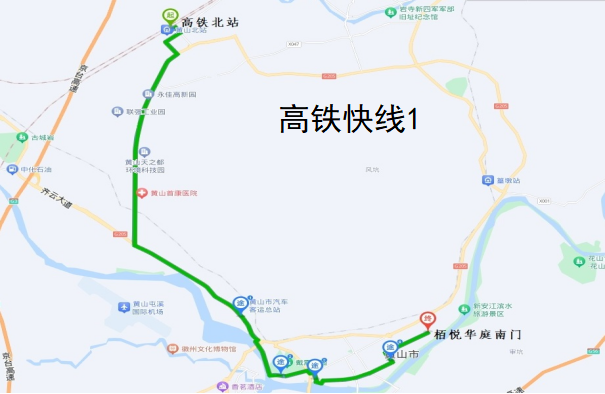 高铁北站—状元首府—黄山高新区管委会—汽车站—黄山眼科医院(老街一马路)—商贸城—市医院西门—长干小学(大润发)—三华园北苑—市政府西门—安东新村—世贸绿洲—栢悦华庭南门