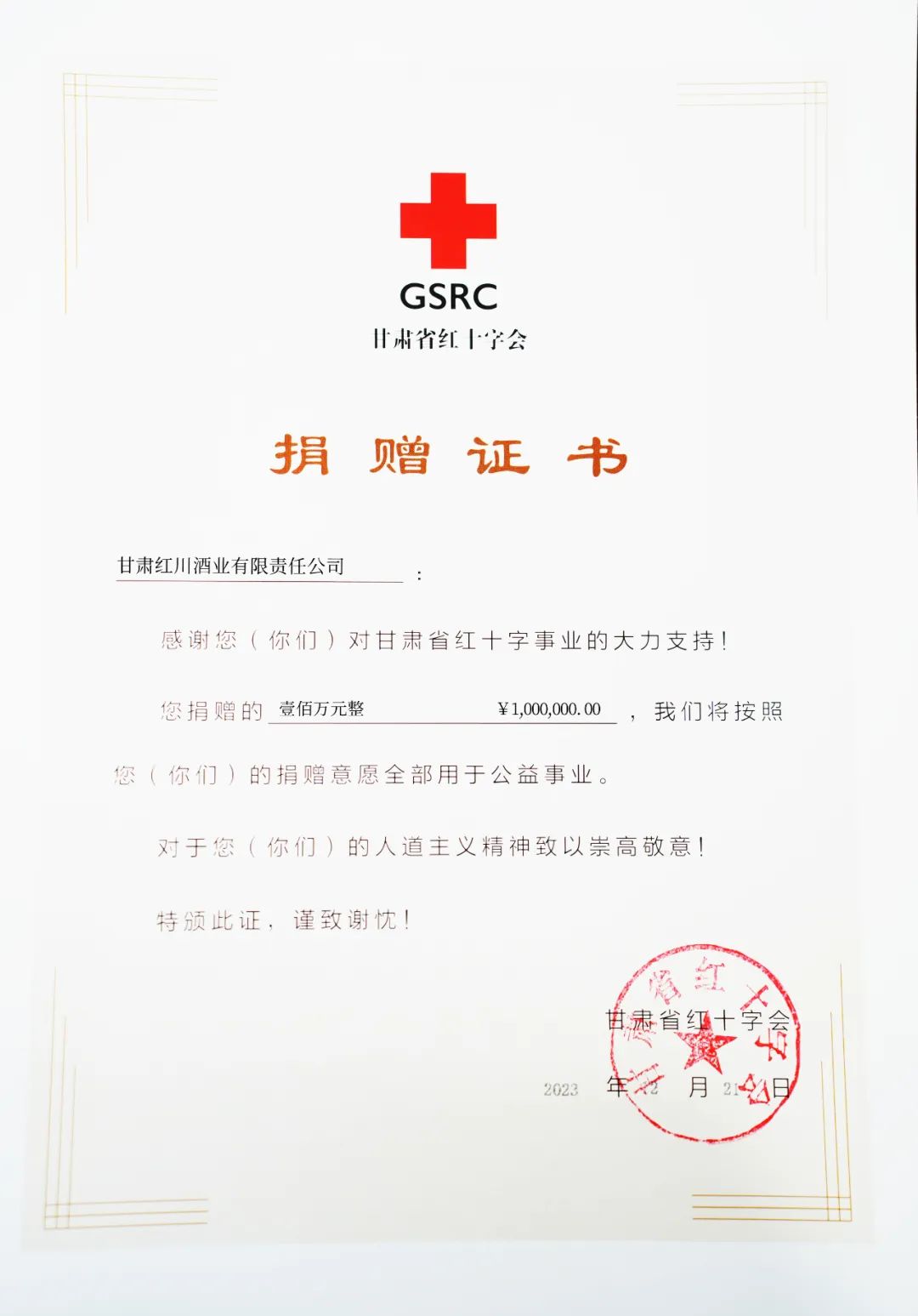 12月18日深夜,甘肃省临夏州积石山县发生6.2级地震,灾情牵动着全国人民的心。甘肃红川酒业有限责任公司时刻关注灾情、心系灾区人民,通过甘肃省红十字会向积石山灾区捐款100万元,用于帮助灾区人民渡过难关、重建家园。