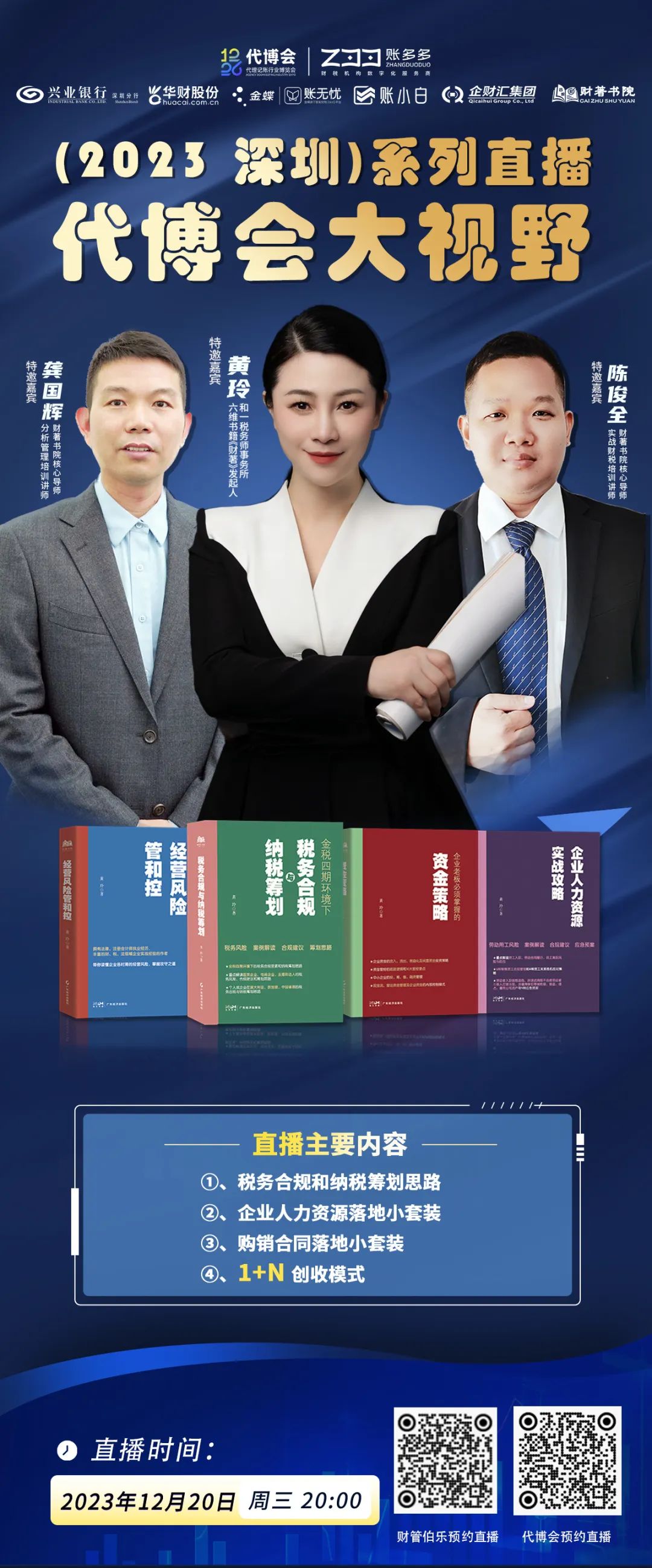 2023年12月20日晚上8点,本期为“代博会”系列直播的首期,代博会特邀《财著》六维工具书作者黄玲老师为直播嘉宾!与【财著书苑】的财税规范实战派老师龚国辉,税务规划实战派老师陈俊全进行连麦直播分享《1+N创收模式分享》。!