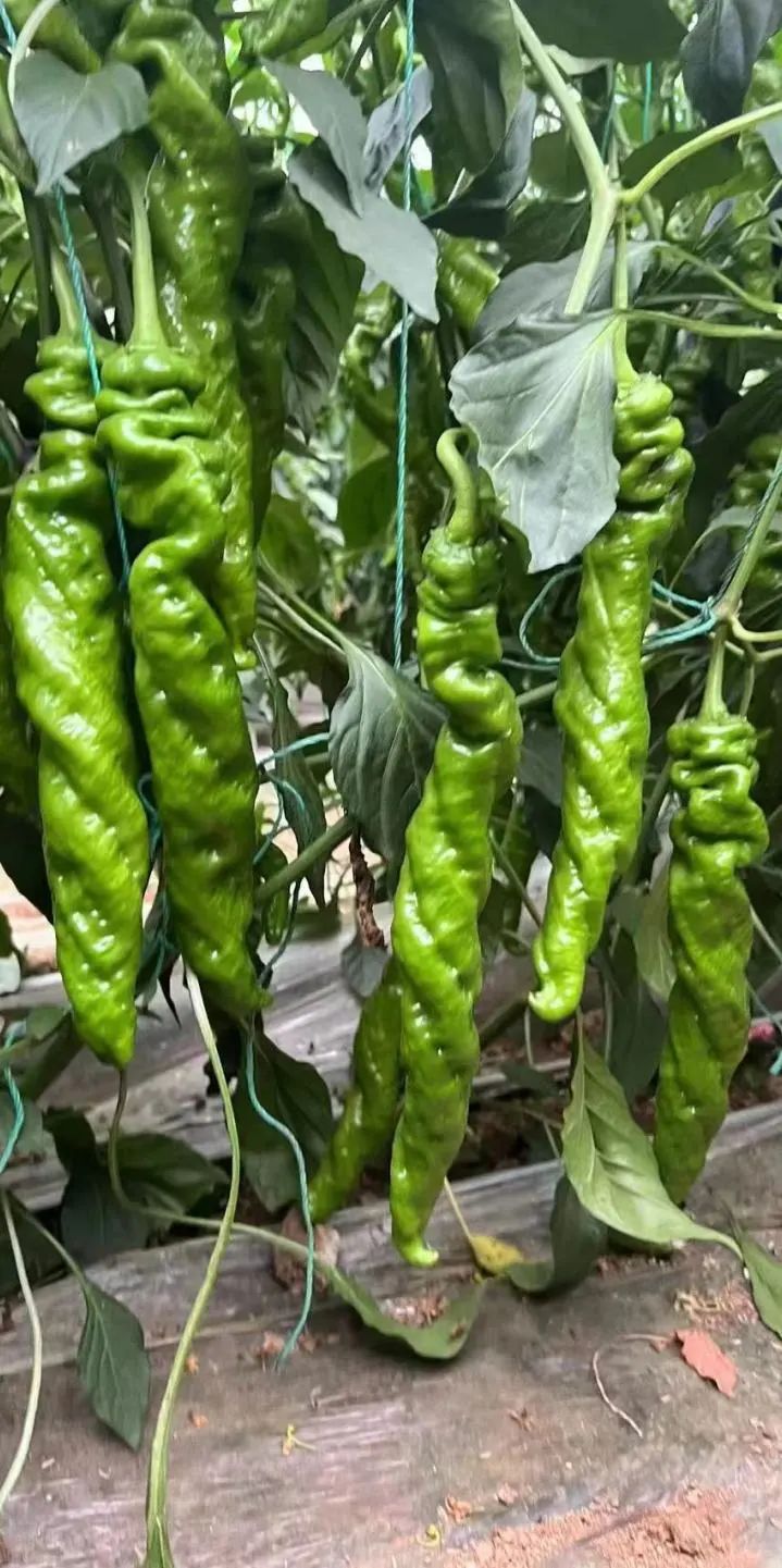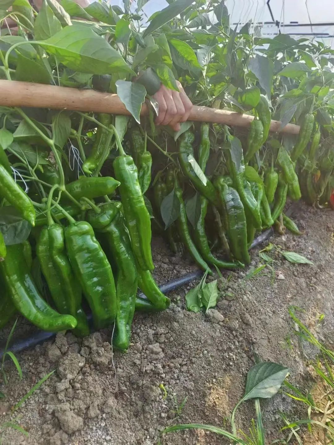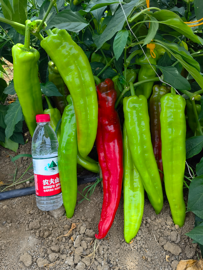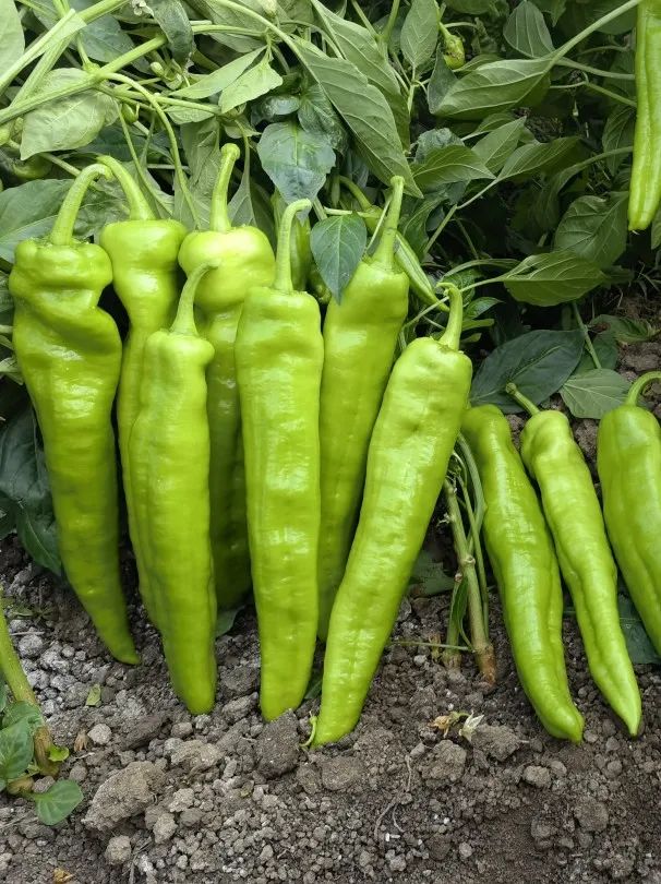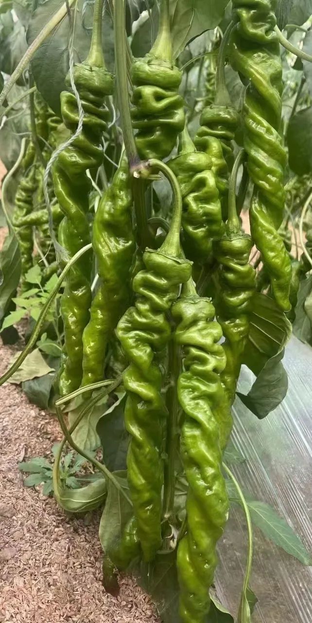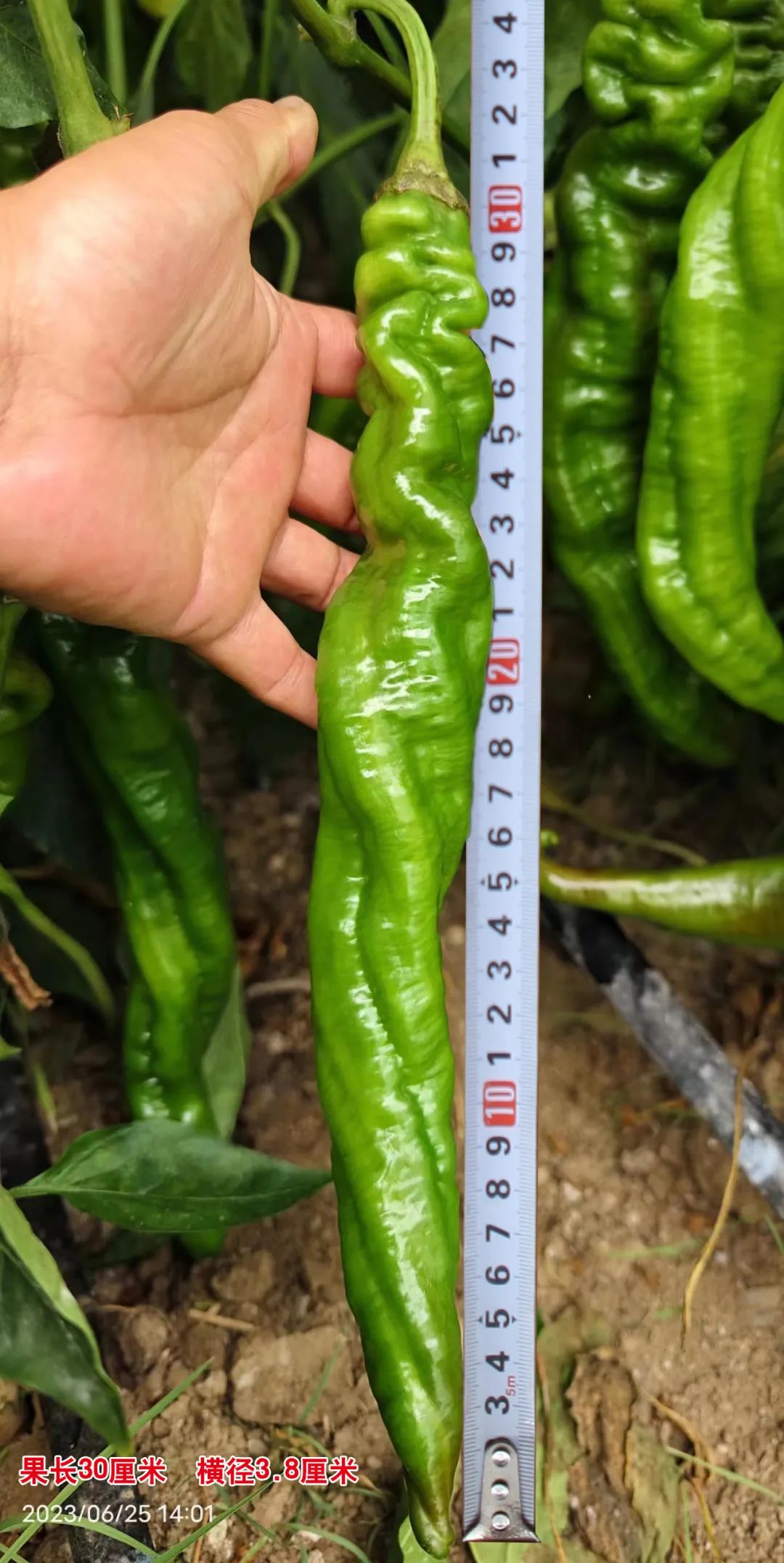 早熟,果实粗长羊角形,果色亮绿,辣味中等,结果多且连续结果能力强。果肩部有皱褶,果型全螺旋且较顺直。正常气候管理条件下,一般果长30.0cm。横径4.0cm,采收前后期果实间差异小,膨果速度快,商品率较高,经济效益好。