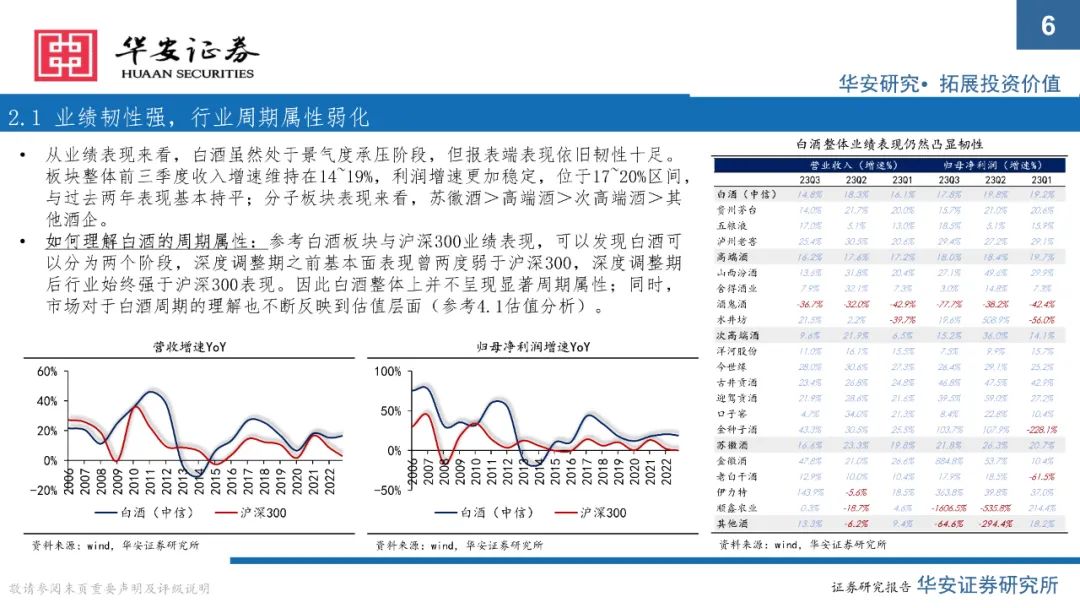 从业绩表现来看,白酒虽然处于景气度承压阶段,但报表端表现依旧韧性十足。板块整体前三季度收入增速维持在14~19%,利润增速更加稳定,位于17~20%区间,与过去两年表现基本持平。
