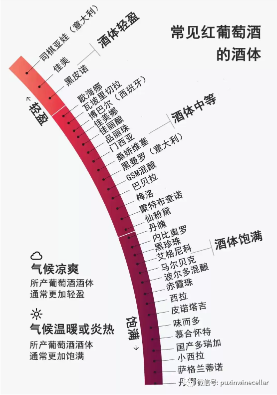 葡萄酒的它是由酒的酸度、单宁和酒精度数等因素共同决定的。酒体可以分为轻、中、重三种类型。每一款葡萄酒的各种成分比例都不尽相同,影响酒体的因素有很多的方面,包括酒精度、残留的糖分、酸度、可溶性风味物质等。